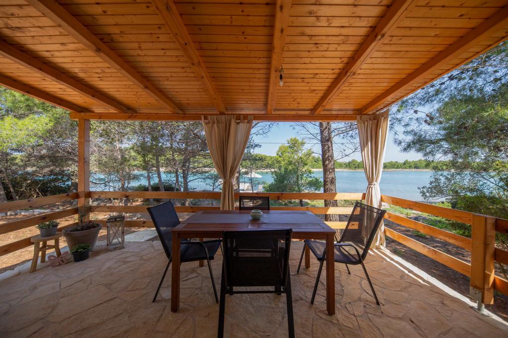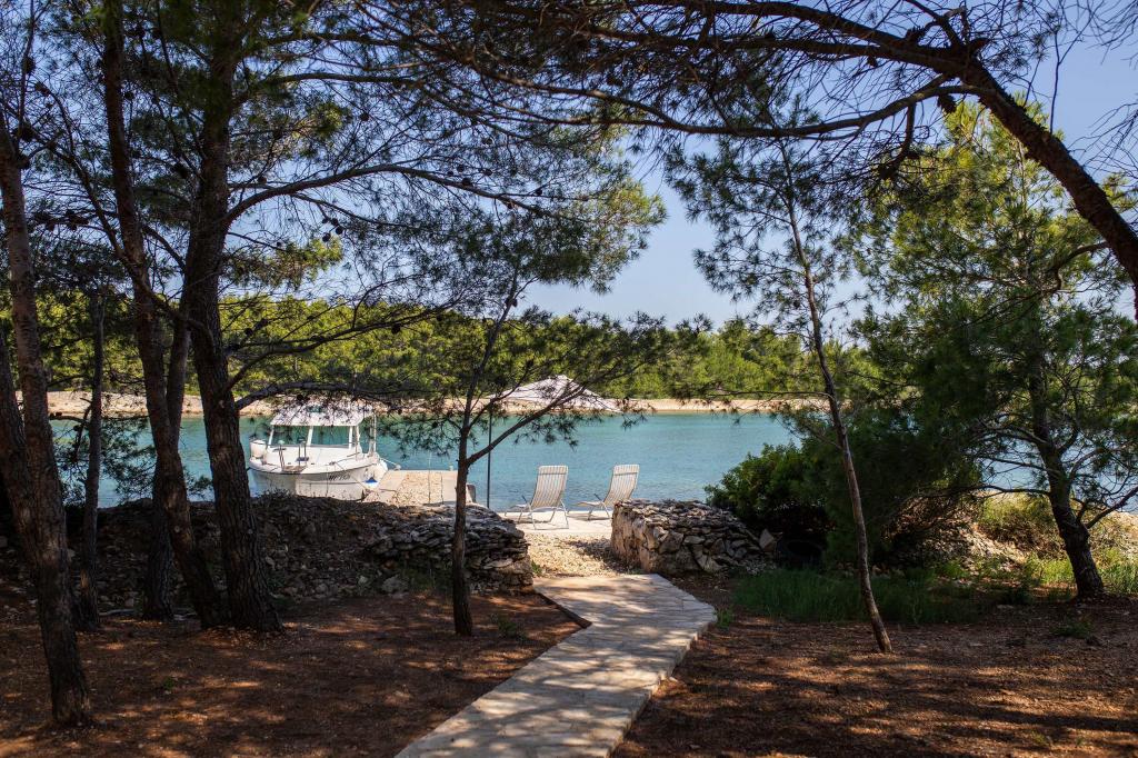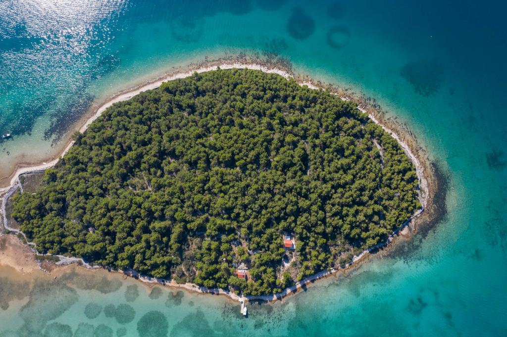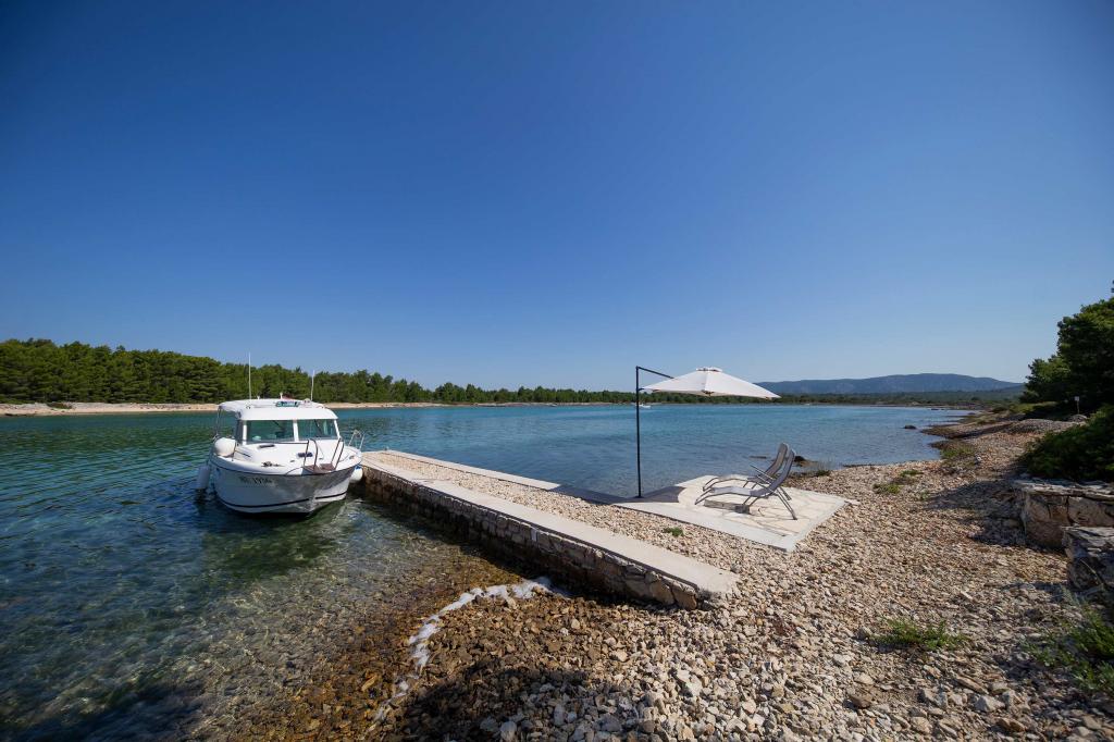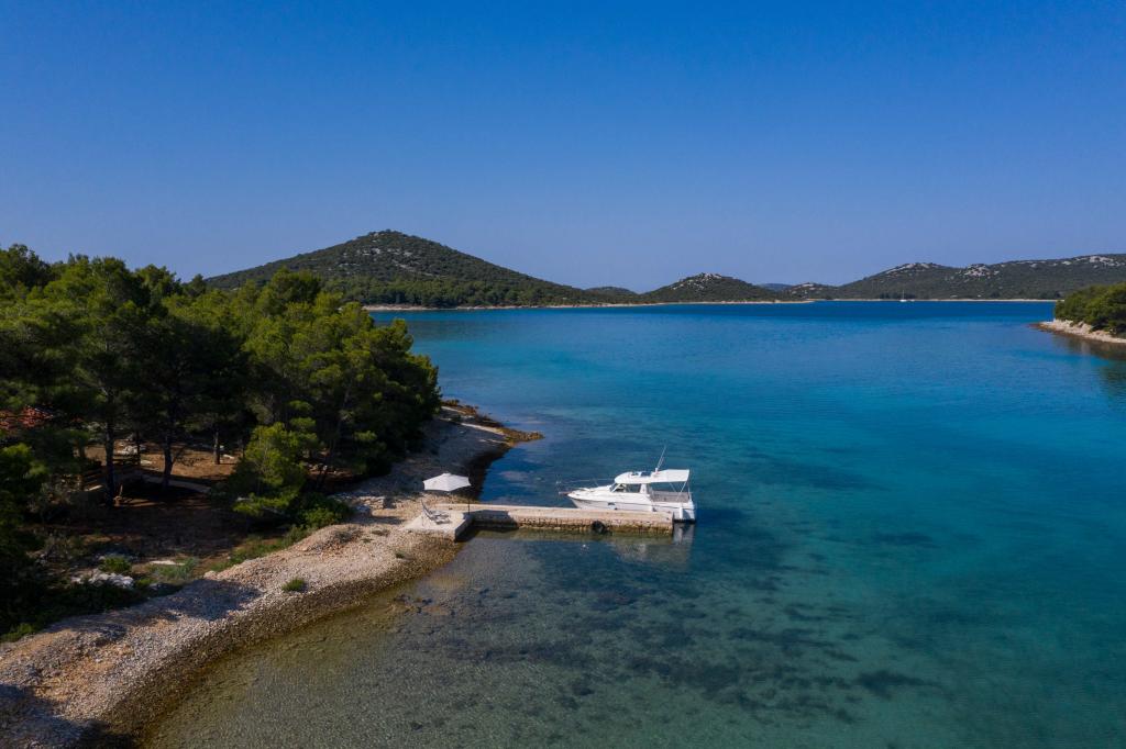Das Sea House Modrave befindet sich in der Zečica-Bucht, 15 Minuten von Murter entfernt. Es ist 10 Meter vom Meer entfernt und verfügt über einen eigenen Bootsanleger. Die Anlage ist nur mit dem Boot erreichbar. Kostenlose Parkplätze stehen in Murter zur Verfügung, ebenso wie ein Transfer zum Haus. Das Haus verfügt über ein Schlafzimmer mit Doppelbett, ein Badezimmer mit Dusche und ein Schlafsofa für zwei weitere Personen. Die Küche ist mit einem Kühlschrank mit Gefrierfach und einem Gasherd ausgestattet. Zur Ausstattung gehören ein Fernseher mit Satellitenempfang, Internetanschluss mit WLAN und eine Klimaanlage. Das Haus wird mit Solarenergie und Regenwasser betrieben, was bei sparsamer Nutzung ausreichend ist. Haustiere sind erlaubt und kosten 5 Euro pro Tag.