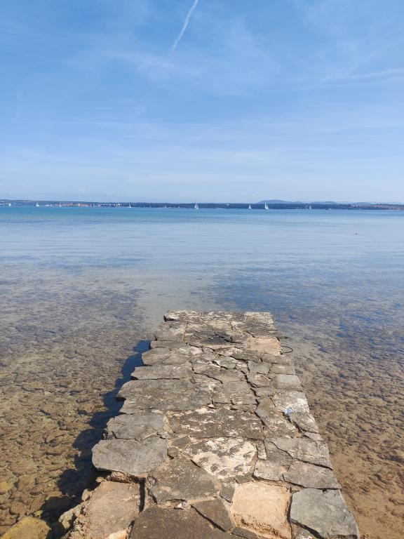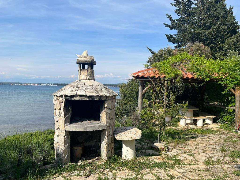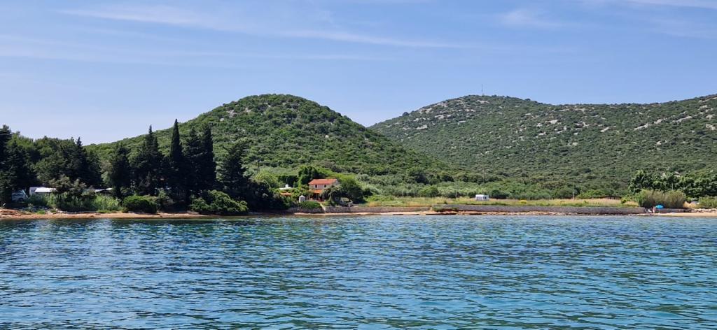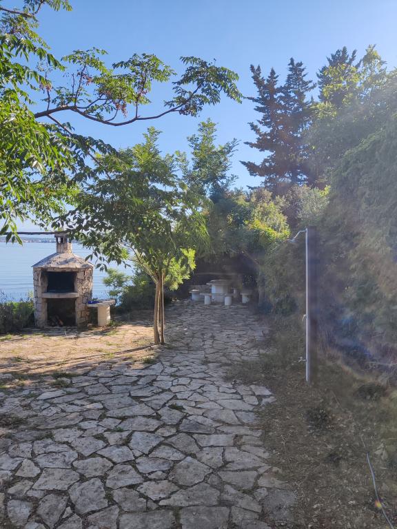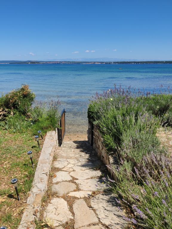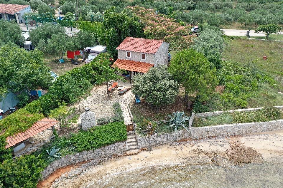 Das Haus liegt südlich des Zentrums von Tkon auf der Insel Pašman, direkt an der Straße. Sie können durch das Tor fahren und direkt neben dem Haus parken. Unmittelbar daneben befindet sich ein FKK-Campingplatz, der von Kletterpflanzen verdeckt wird. Das erste Gebäude auf der anderen Seite ist 50 m entfernt. Das Haus liegt 10 m vom Meer und einem Sandstrand entfernt. Das Meer ist etwa einen halben Meter tief und hat einen sandigen Grund, ideal für Kinder. Vor dem Haus befindet sich eine überdachte Holzterrasse mit Tisch und Bänken, auf der Sie im Schatten sitzen und Ihr Mittagessen genießen können. Gleich daneben steht ein Steingrill. Ein Sonnensegel spendet ebenfalls Schatten. Auf der Terrasse befindet sich eine Außendusche.