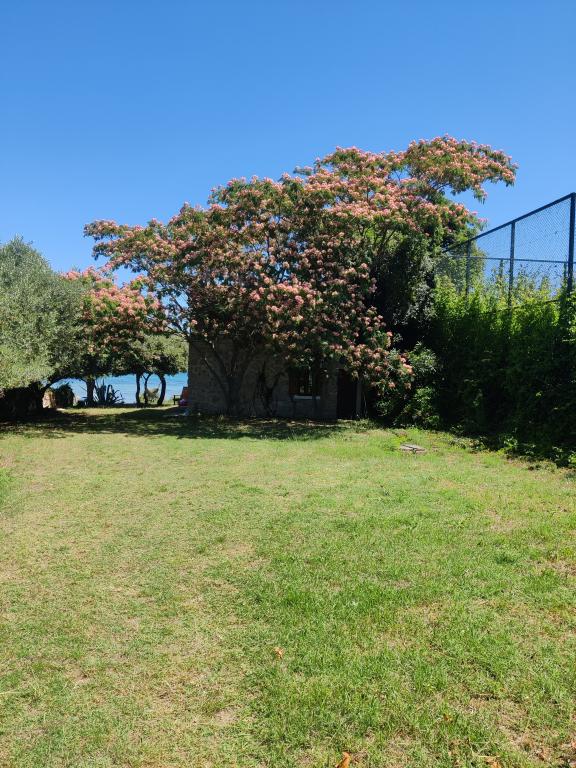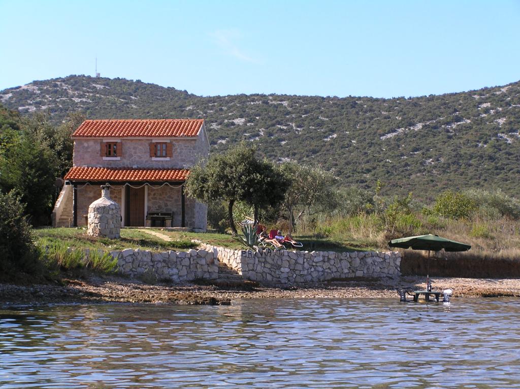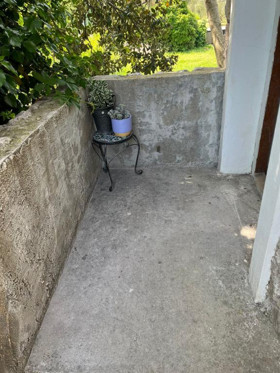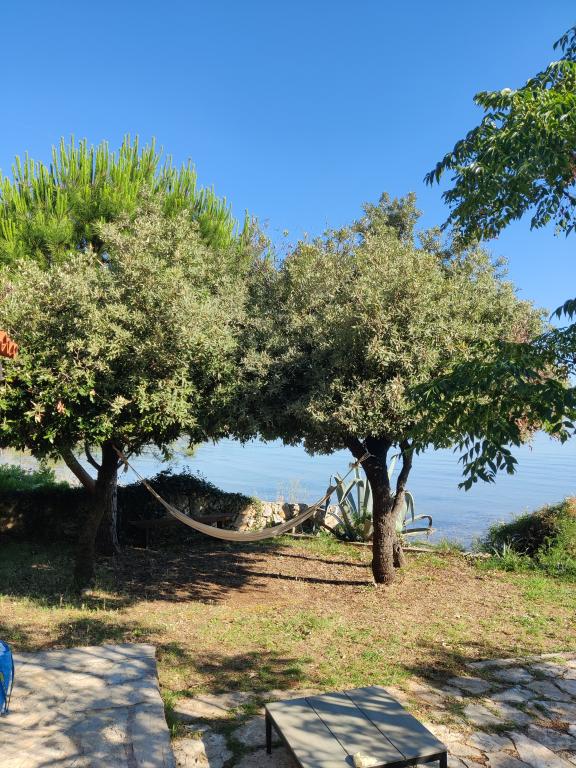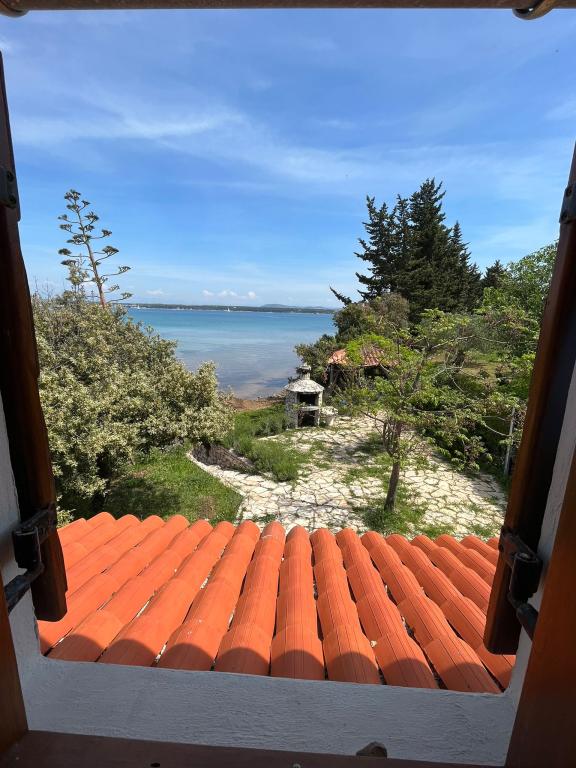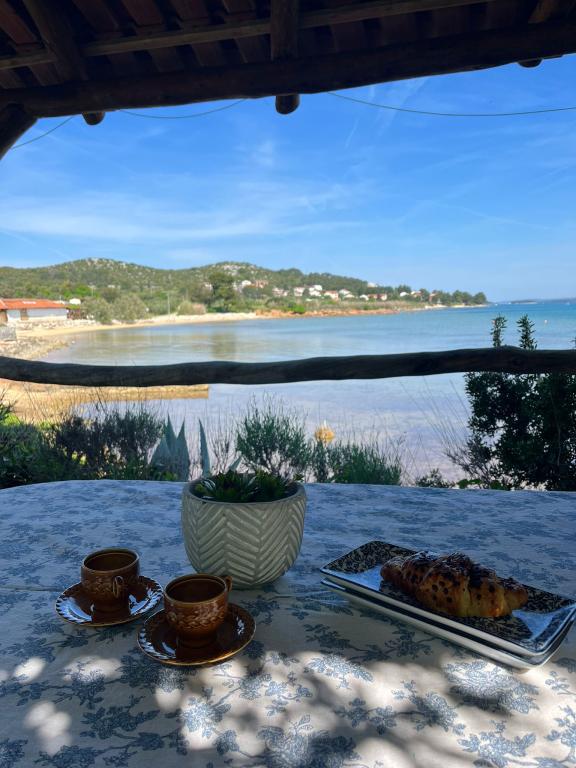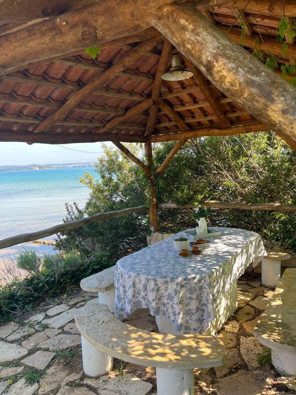 Das Haus liegt südlich des Zentrums von Tkon auf der Insel Pašman, direkt an der Straße. Sie können durch das Tor fahren und direkt neben dem Haus parken. Unmittelbar daneben befindet sich ein FKK-Campingplatz, der von Kletterpflanzen verdeckt wird. Das erste Gebäude auf der anderen Seite ist 50 m entfernt. Das Haus liegt 10 m vom Meer und einem Sandstrand entfernt. Das Meer ist etwa einen halben Meter tief und hat einen sandigen Grund, ideal für Kinder. Vor dem Haus befindet sich eine überdachte Holzterrasse mit Tisch und Bänken, auf der Sie im Schatten sitzen und Ihr Mittagessen genießen können. Gleich daneben steht ein Steingrill. Ein Sonnensegel spendet ebenfalls Schatten. Auf der Terrasse befindet sich eine Außendusche.