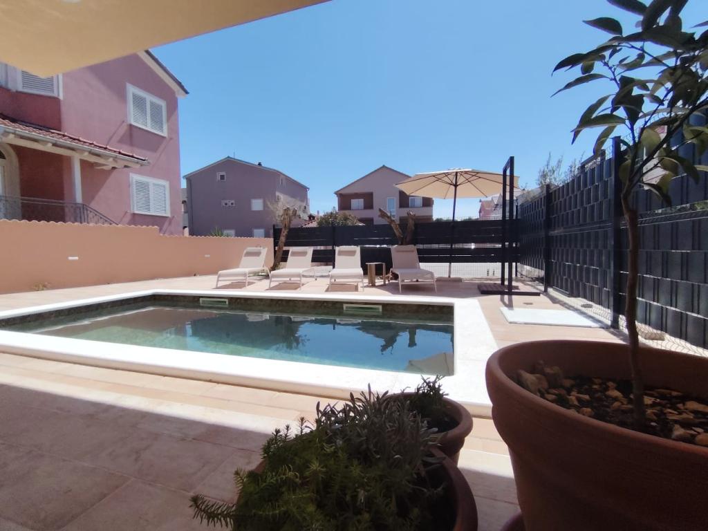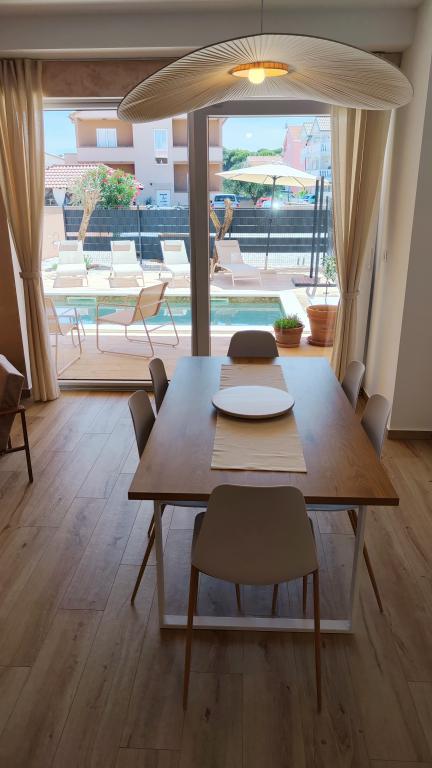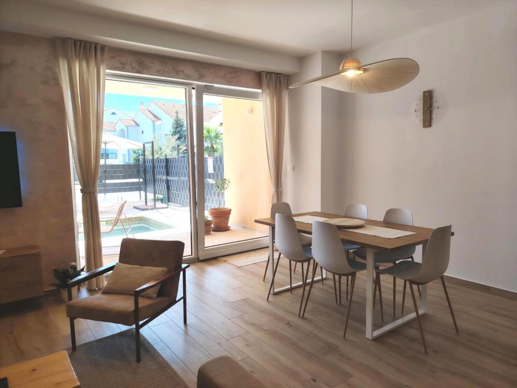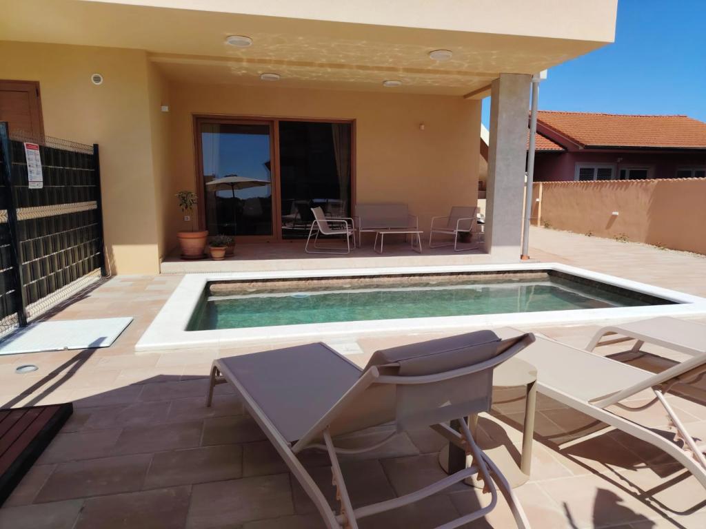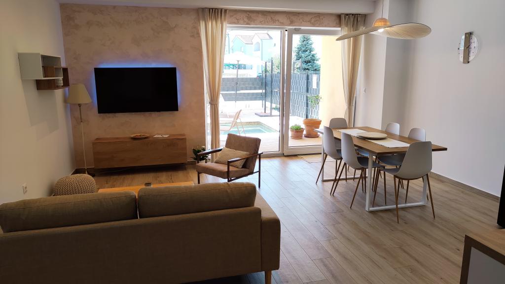 Neu erbautes zweistöckiges Ferienhaus mit Swimmingpool und zwei separaten Wohneinheiten (Erdgeschoss und Obergeschoss). Jede Wohneinheit ist 95 Quadratmeter groß und verfügt über drei Schlafzimmer, Küche, Bad, Terrasse und Wohnzimmer. Parkplätze sind vorhanden.