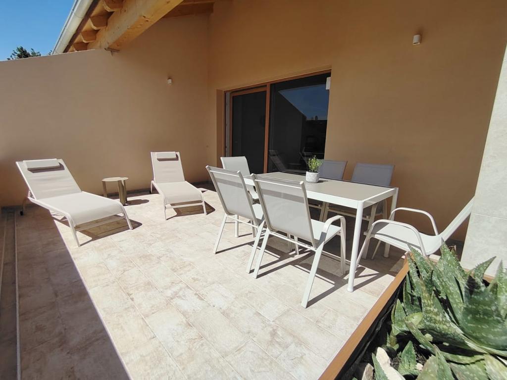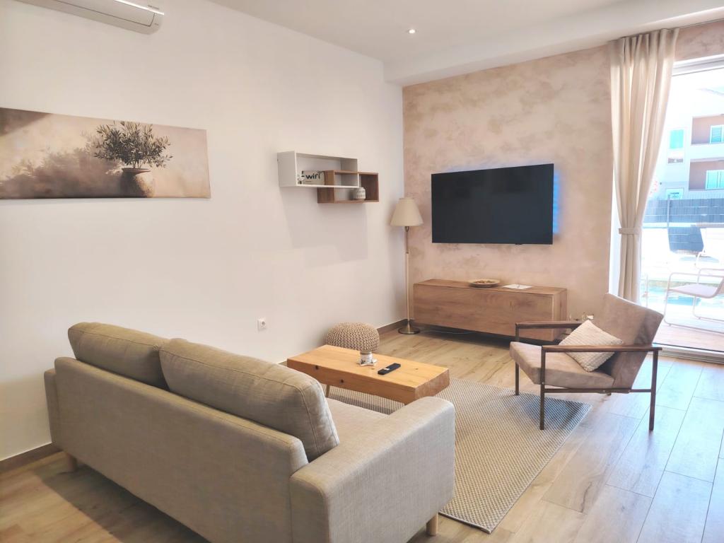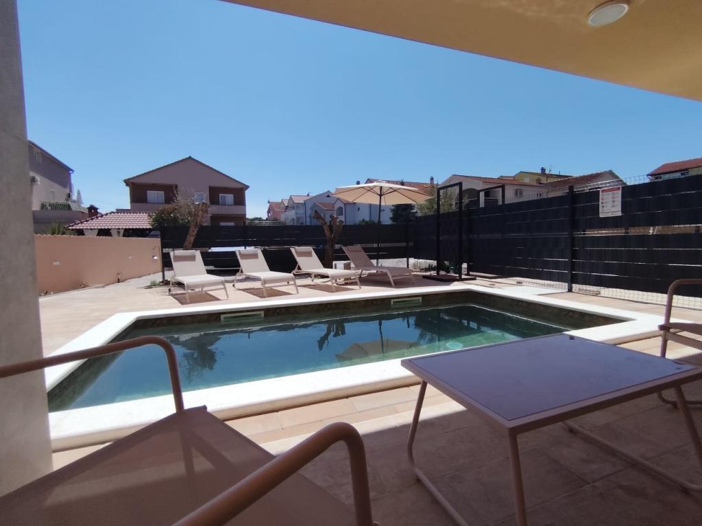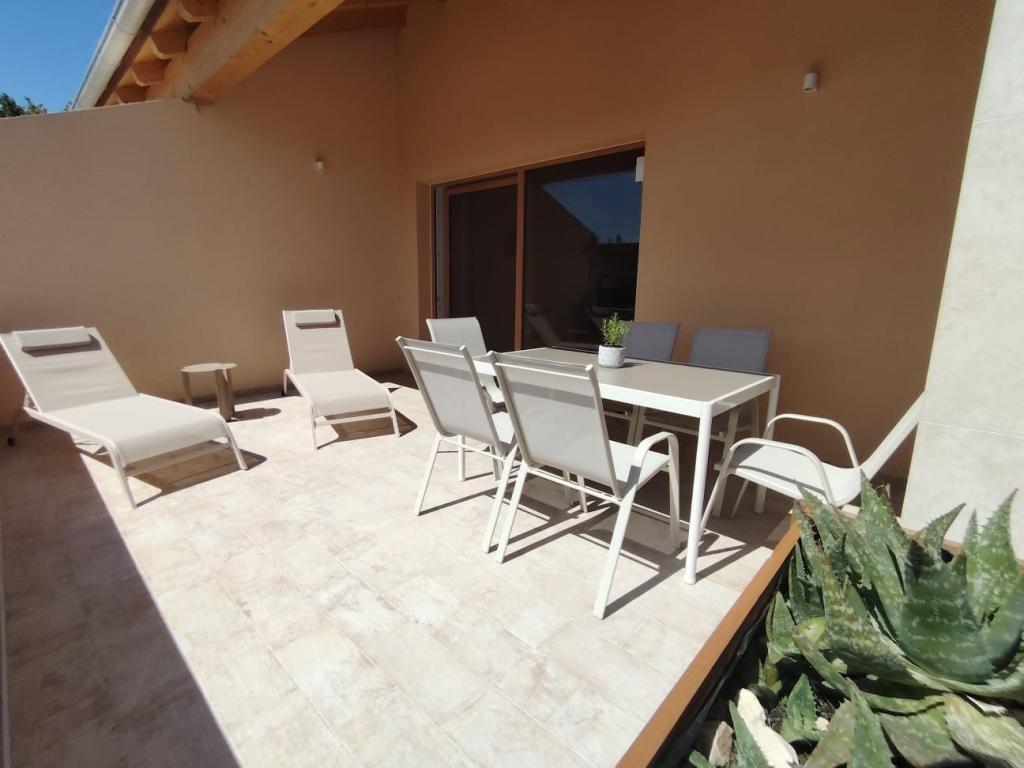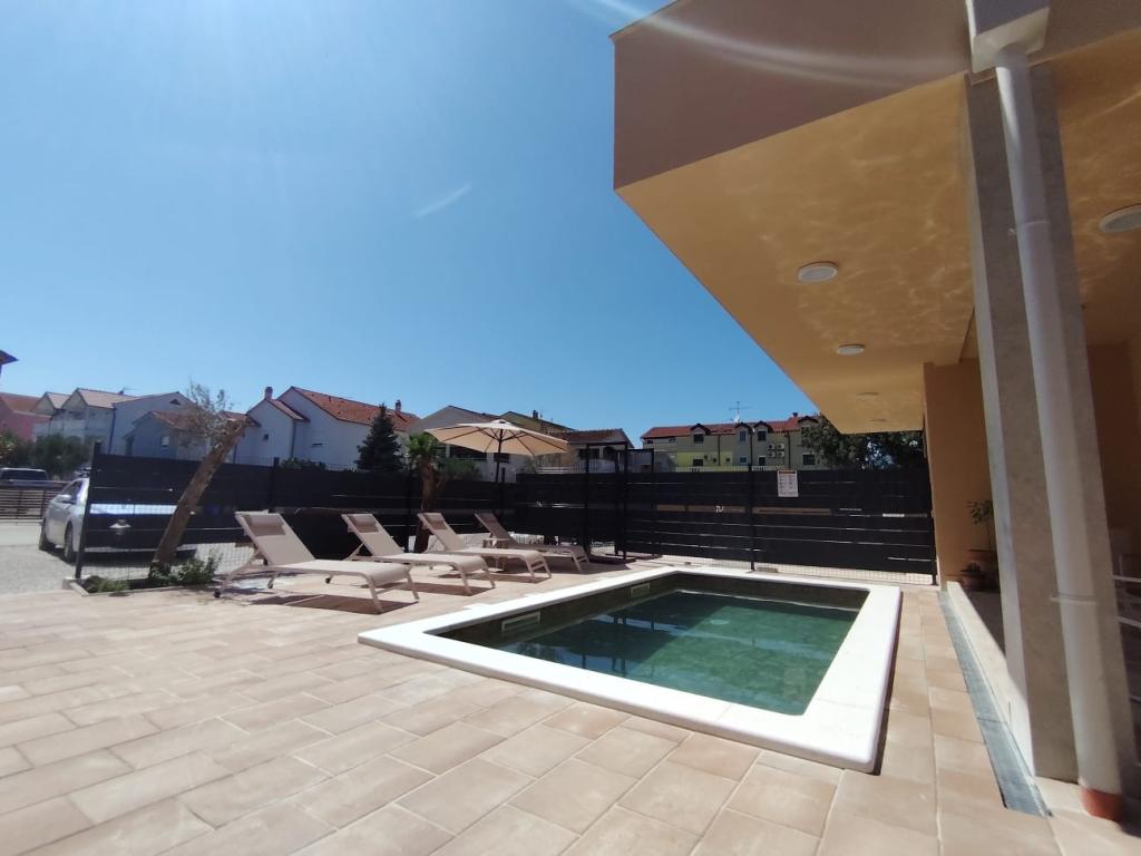 Neu erbautes zweistöckiges Ferienhaus mit Swimmingpool und zwei separaten Wohneinheiten (Erdgeschoss und Obergeschoss). Jede Wohneinheit ist 95 Quadratmeter groß und verfügt über drei Schlafzimmer, Küche, Bad, Terrasse und Wohnzimmer. Parkplätze sind vorhanden.