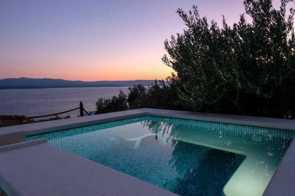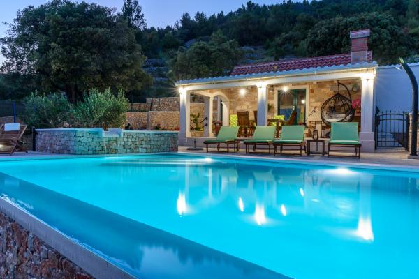 Kurtaxe ist im Preis inbegriffen.Die Villa ist ein neu erbautes Haus (2017), das mit allen Annehmlichkeiten ausgestattet ist, die Sie für einen angenehmen und angenehmen Urlaub benötigen. Die Villa verfügt über eine Waschmaschine, Bügeleisen, Bügelbrett, Haartrockner, Geschirrspüler, Safe, Wecker, Mikrowelle, Herd, Backofen, Klimaanlage, drei Plasmafernseher, einen komfortablen Außenbereich mit einem schönen Grill und eine Sonnenterrasse zum Entspannen der beheizte Pool und die Whirlpool-Massage. Kommen Sie und genießen Sie Ihren Sommerurlaub bei uns! Wie Sie sehen werden, bietet dieser Teil von Bol von der Villa aus eine unglaublich spektakuläre Aussicht. Sie sind von unseren Weinbergen und Olivenbäumen umgeben und blicken auf den Brač-Kanal (Meer) mit wunderschönen Sonnenuntergängen und Sonnenstrahlen. Es ist sehr privat und abgeschieden. Ein Auto ist ni