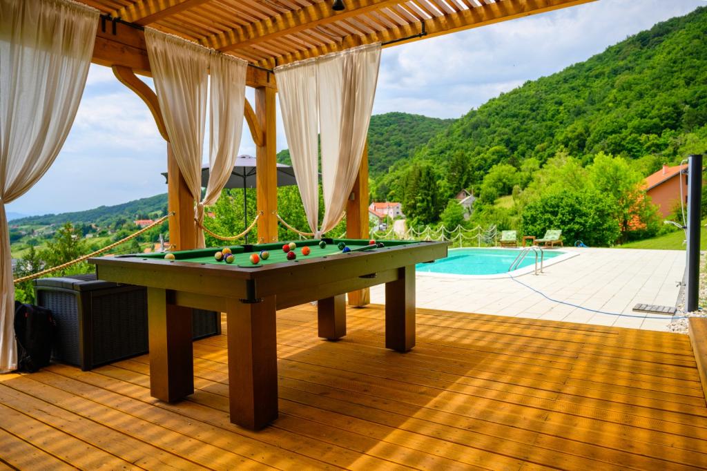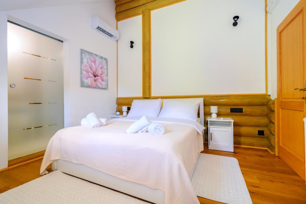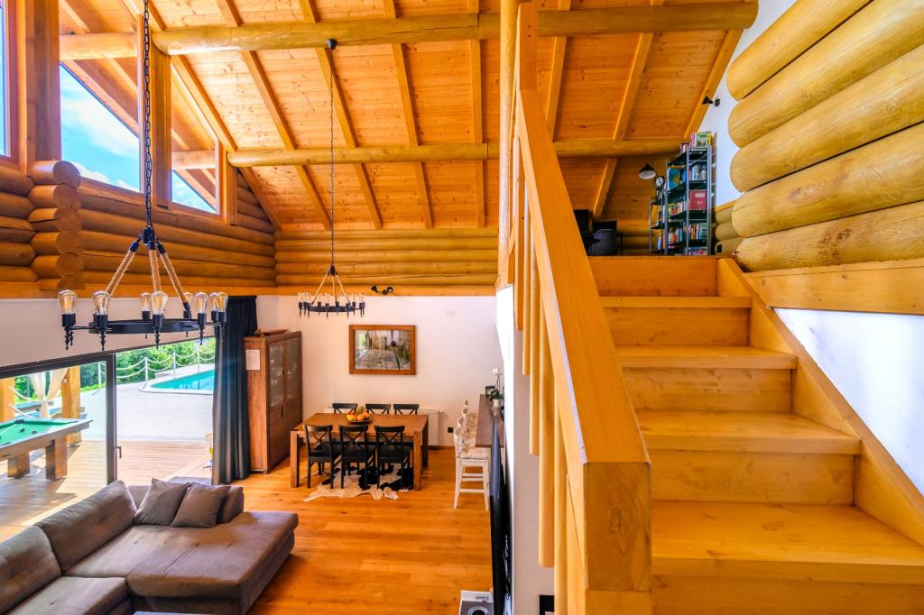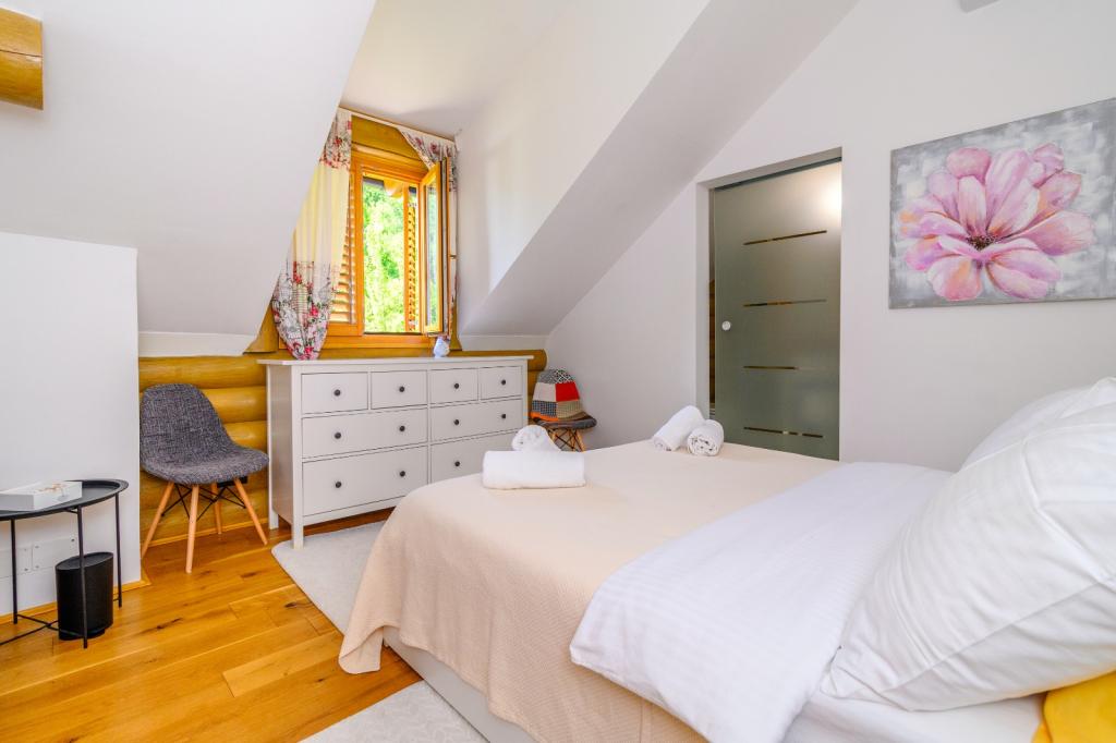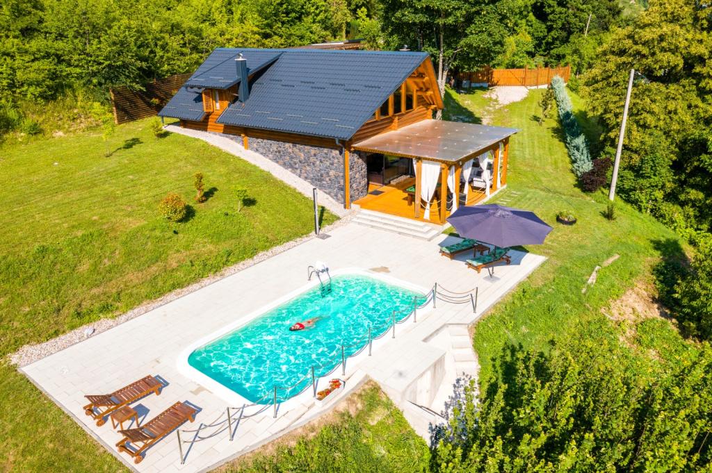 Nicht weit von Zagreb, nur 44 km entfernt und 350 Meter über dem Meeresspiegel, am Fuße des Japetić-Gebirges, befindet sich das Holzhaus Wellspring in Sveta Jana (Gorica Svetojanska). Ein Teil des Grundstücks (von insgesamt 2.700 m2) gehört zum Schutzgebiet des Naturparks Žumberak und ist daher ein besonders inspirierender Ort für den Urlaub. Im Dorf selbst gibt es mehrere natürliche Trinkwasserquellen und das erste größere Dorf Jastrebarski ist 9 km entfernt. Das Holzhaus Wellspring besteht aus zwei Etagen mit kostenlosem WLAN. Auf der unteren Etage befindet sich ein offener Wohnbereich mit Kamin, ein gut ausgestattetes Esszimmer und eine Küche, ein Schlafzimmer, ein Wellnessbereich mit finnischer Sauna und Whirlpool, eine ebenerdige Dusche und ein WC. Im Obergeschoss befinden sich zwei Schlafzimmer mit eigenen Bädern und Platz auf der Galerie zum Ausruhen/Lesen. Neben dem Kamin gab es auch eine Zentralheizung für die kalten Wintermonate, sowie eine Fußbodenheizung im Wellnessbereich. Die überdachte Terrasse mit Blick nach Süden ist 40 m2 groß und verfügt über einen beheizten Swimmingpool mit Sonnenliege, Dusche und Sonnenliegen.