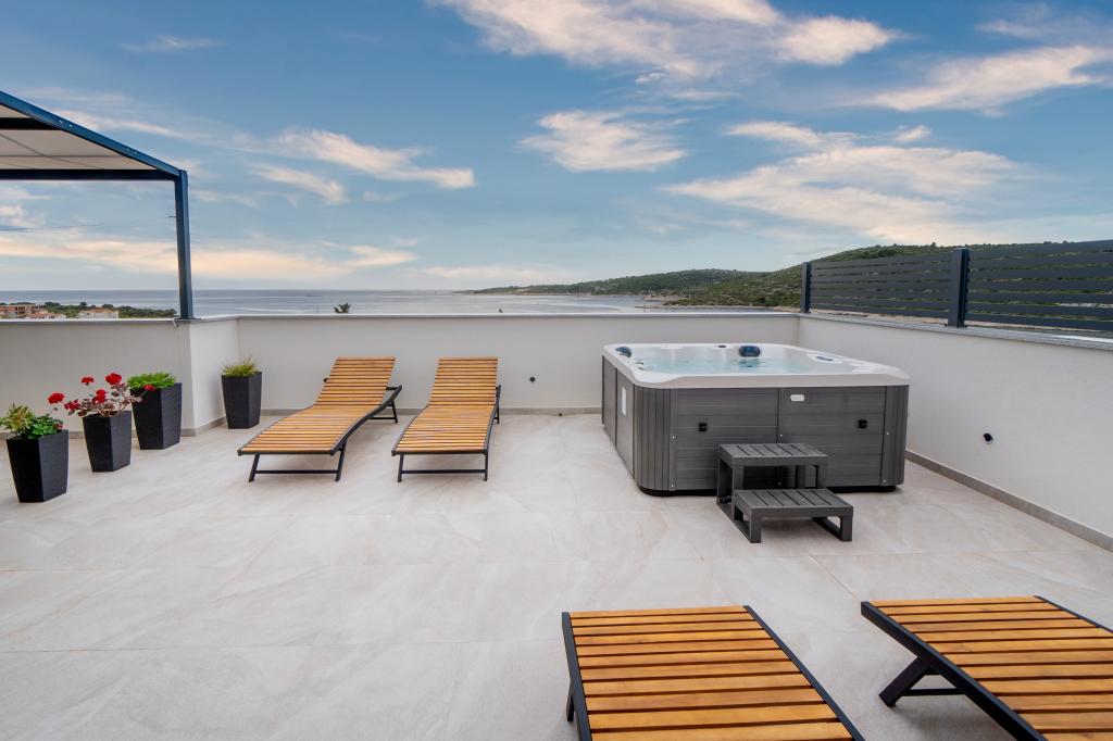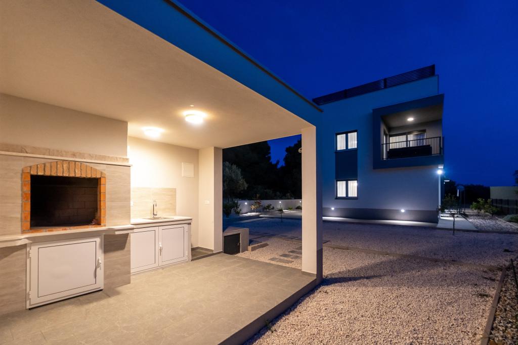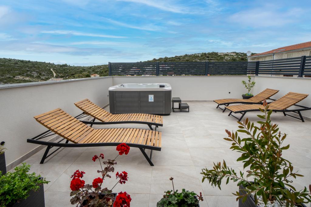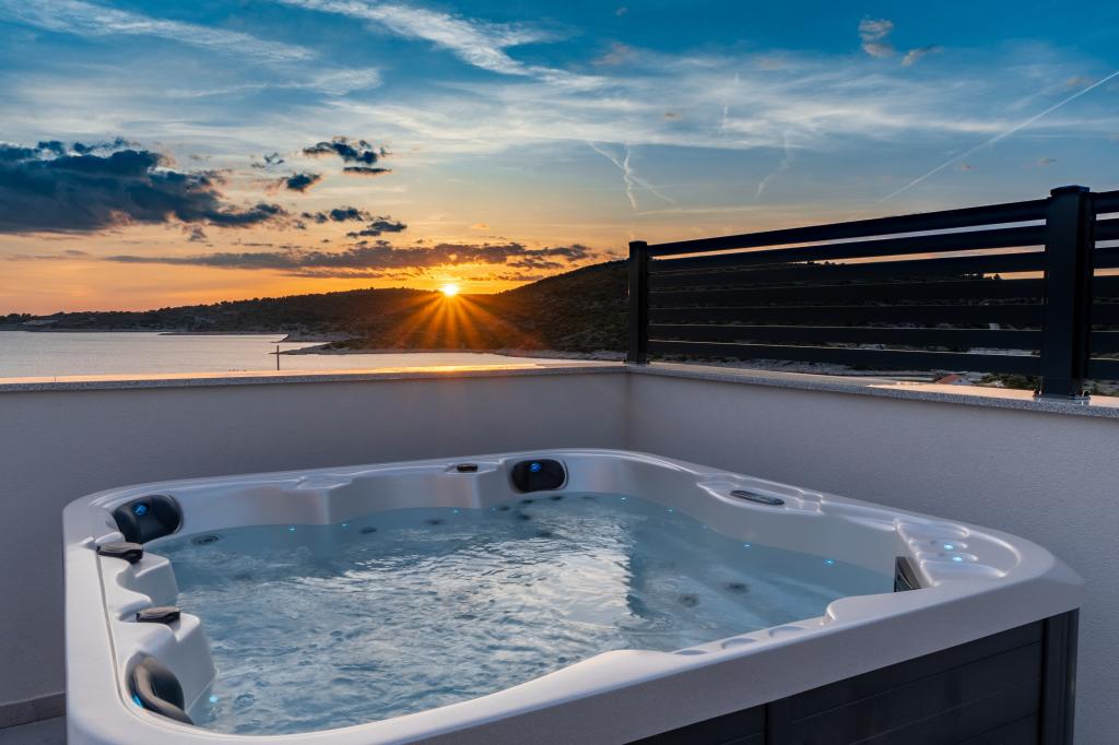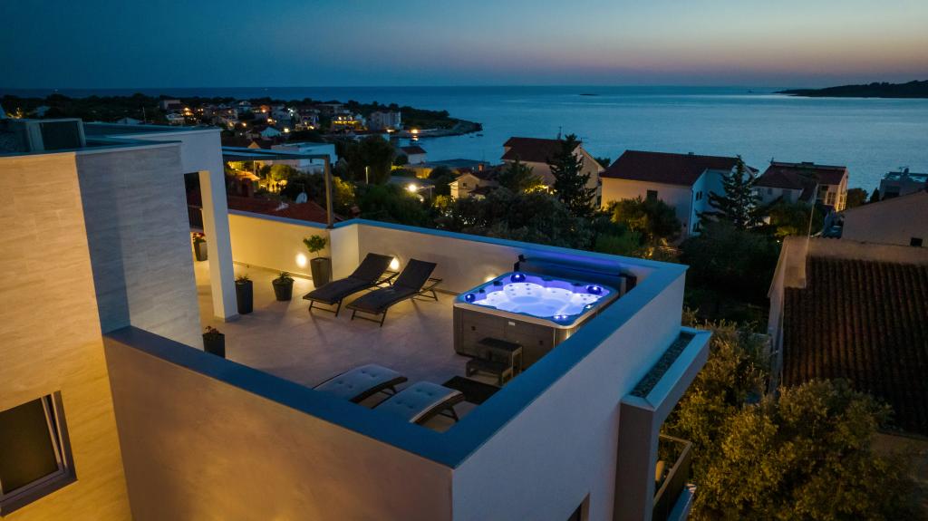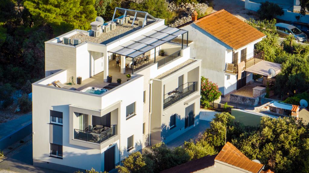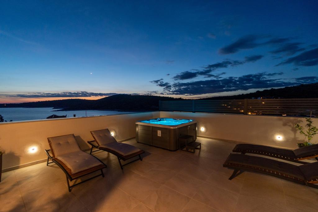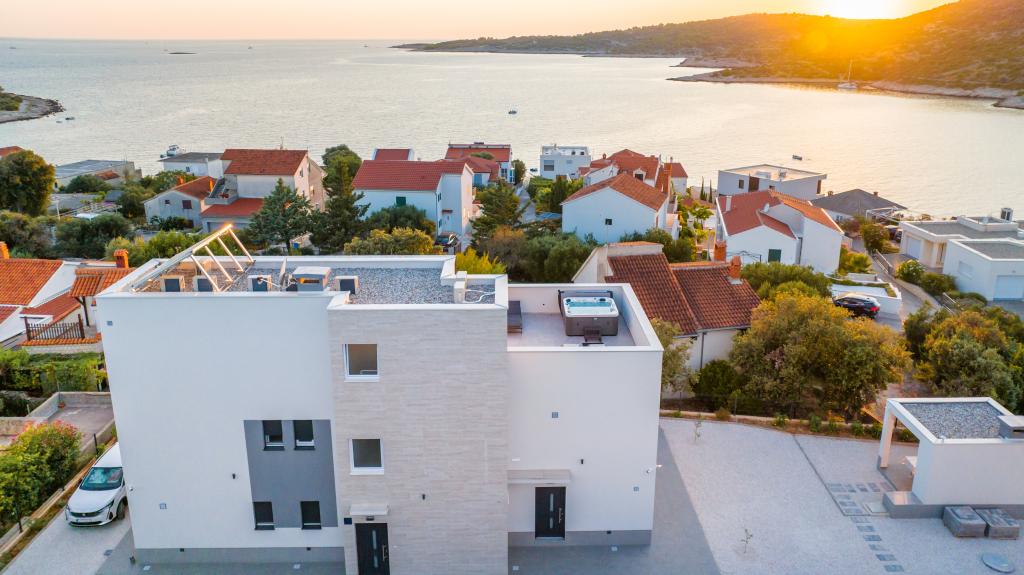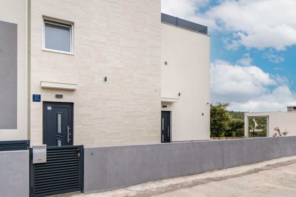 Neue Anlage. Genießen Sie mit Ihrer Familie diese moderne Unterkunft mit wunderschönen Sonnenuntergängen und Meerblick. Ruhige Nachbarschaft. Zwei Wohnungen, die als Ganzes vermietet werden. Im Erdgeschoss befindet sich ein Studio-Apartment bestehend aus einer Küche, einem Badezimmer und einem Zimmer mit einem Doppelbett, außerdem gibt es im Wohnzimmer ein Zustellbett. Im ersten Stock befindet sich eine große Wohnung bestehend aus einer Küche, einem Wohnzimmer, einem Balkon mit Gartenmöbeln ideal für den Morgenkaffee, zwei Zimmern mit einem Doppelbett und einem Zimmer mit zwei getrennten Betten, die bei Bedarf verbunden werden können. Dieses Apartment verfügt über zwei Badezimmer, von denen eines Teil des Zimmers ist, und eine Toilette. Im zweiten Stock des Gebäudes gibt es eine große Terrasse mit Blick auf den gesamten Ort und einer Hydromassagewanne für 5 Personen, Liegestühlen zum Sonnenbaden, Grill, Sommerküche sowie Tisch und Stühlen. Im Außenbereich gibt es auch eine kleinere überdachte Anlage mit Grill, Tisch und Bänken.