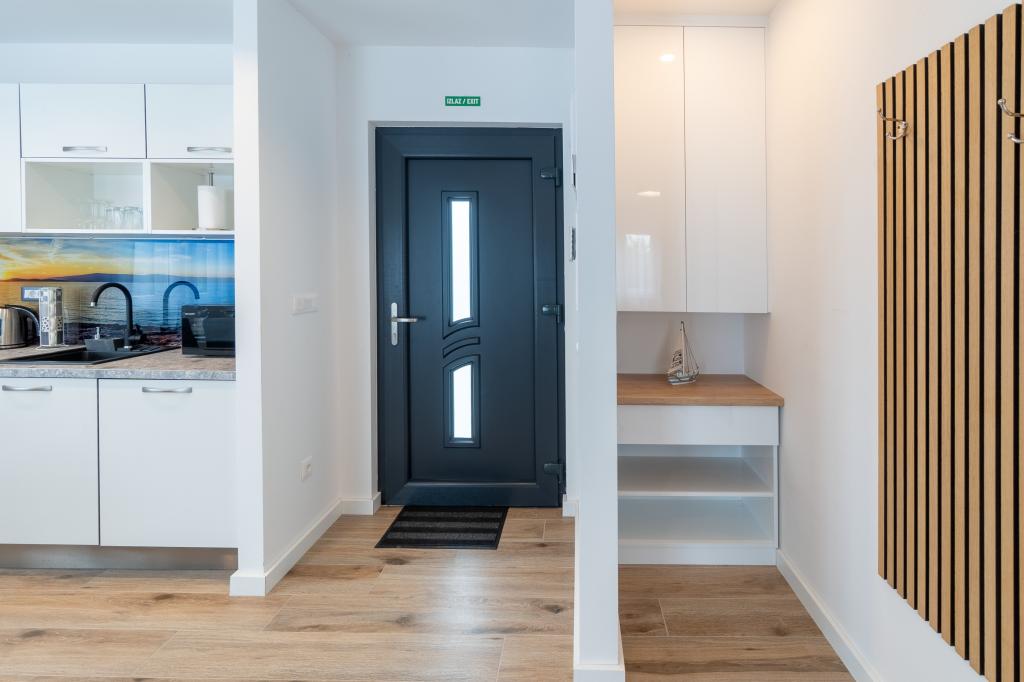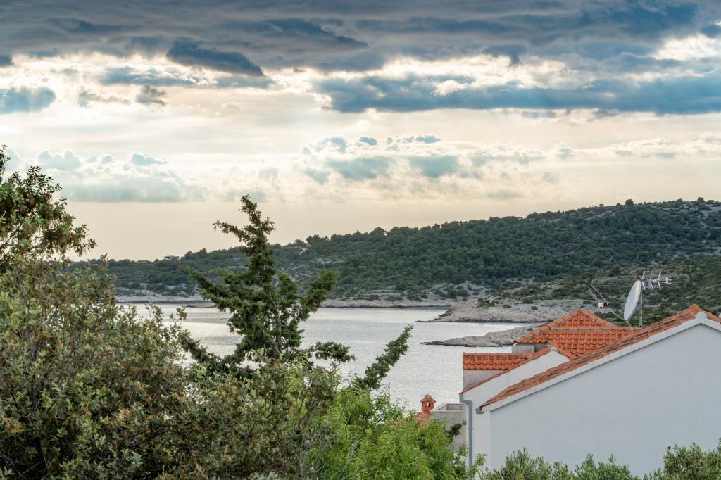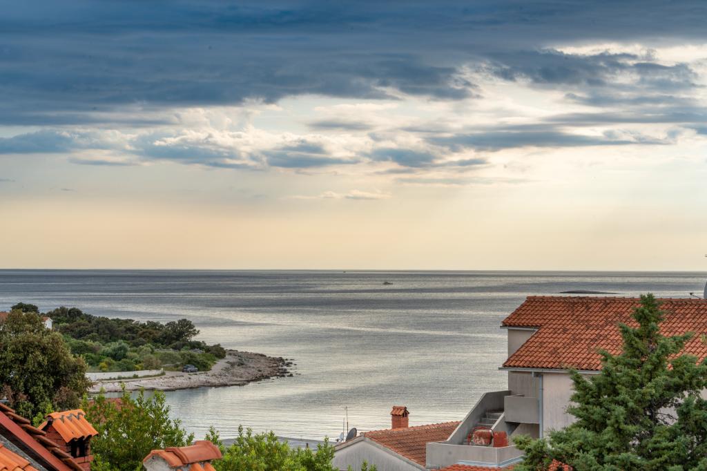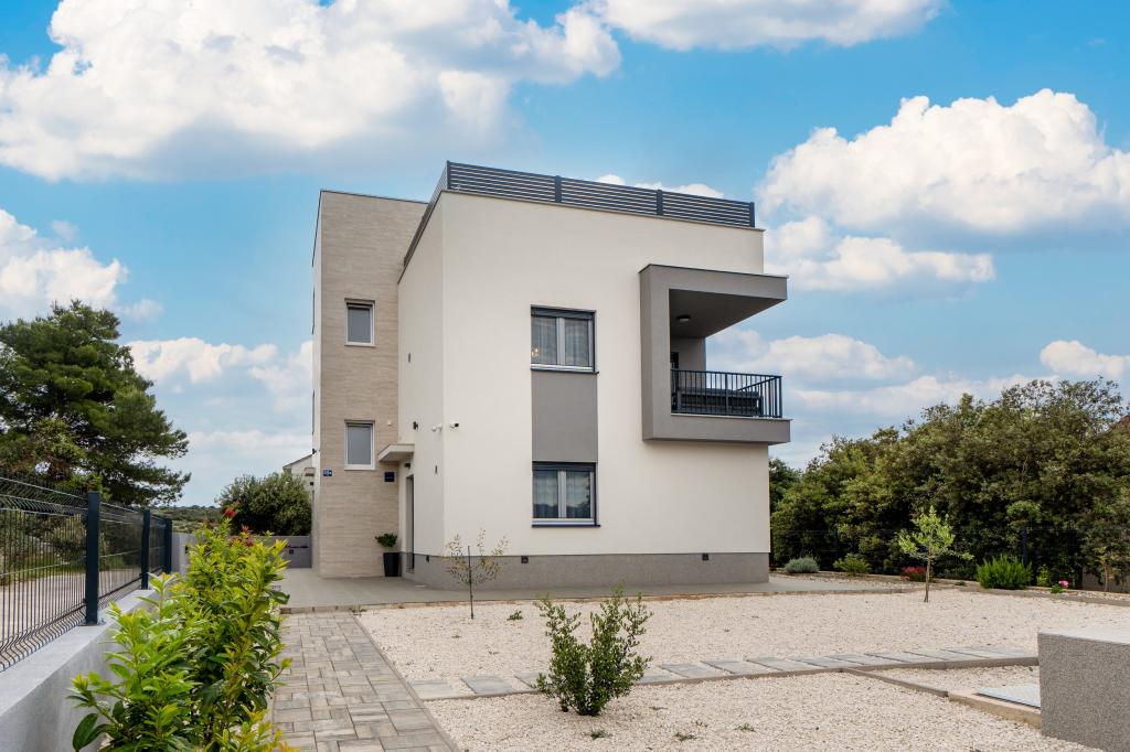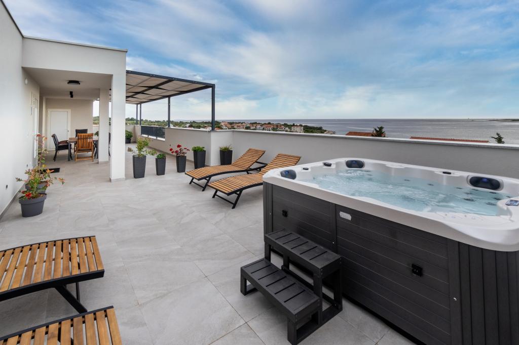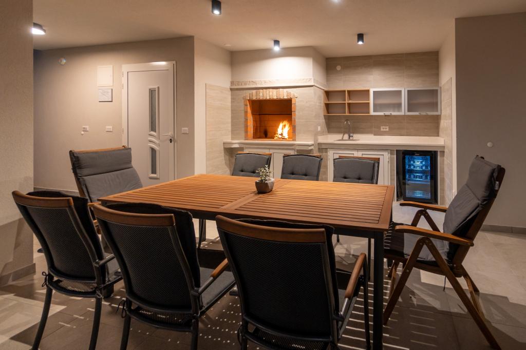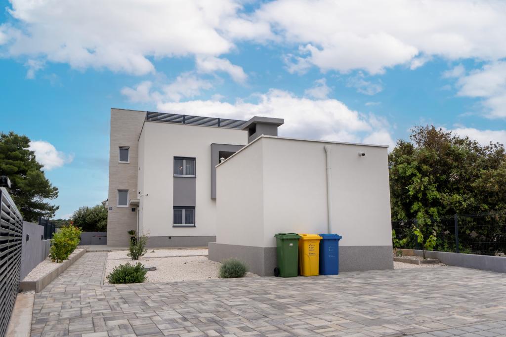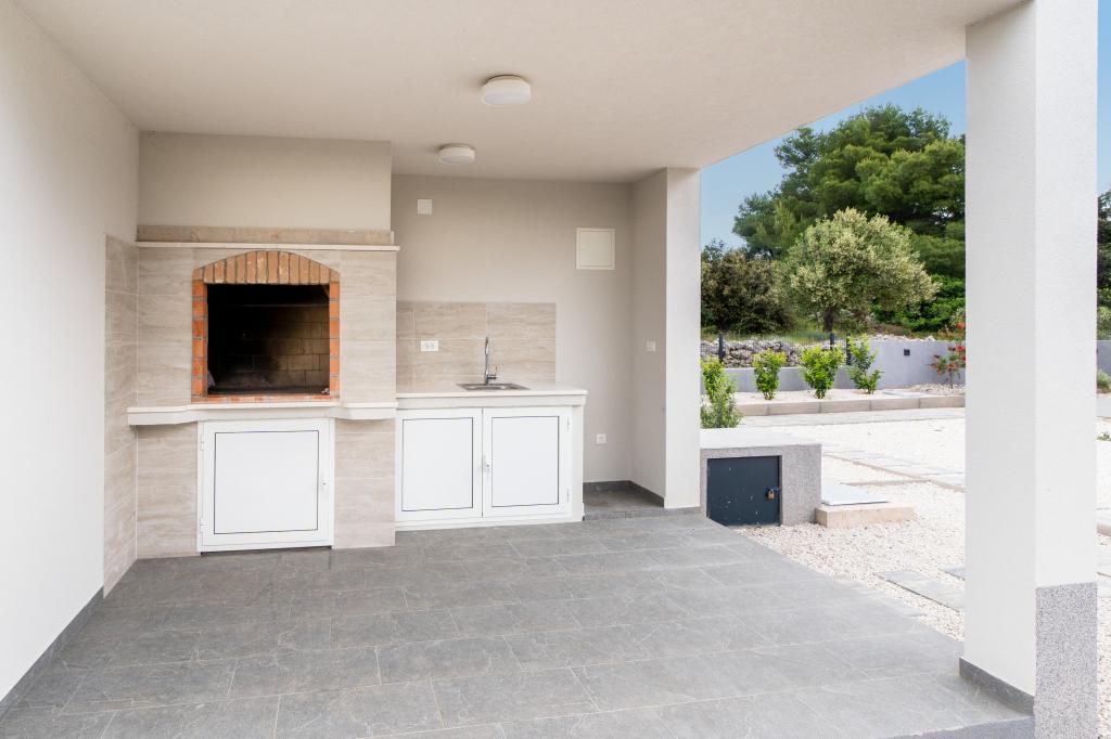 Neue Anlage. Genießen Sie mit Ihrer Familie diese moderne Unterkunft mit wunderschönen Sonnenuntergängen und Meerblick. Ruhige Nachbarschaft. Zwei Wohnungen, die als Ganzes vermietet werden. Im Erdgeschoss befindet sich ein Studio-Apartment bestehend aus einer Küche, einem Badezimmer und einem Zimmer mit einem Doppelbett, außerdem gibt es im Wohnzimmer ein Zustellbett. Im ersten Stock befindet sich eine große Wohnung bestehend aus einer Küche, einem Wohnzimmer, einem Balkon mit Gartenmöbeln ideal für den Morgenkaffee, zwei Zimmern mit einem Doppelbett und einem Zimmer mit zwei getrennten Betten, die bei Bedarf verbunden werden können. Dieses Apartment verfügt über zwei Badezimmer, von denen eines Teil des Zimmers ist, und eine Toilette. Im zweiten Stock des Gebäudes gibt es eine große Terrasse mit Blick auf den gesamten Ort und einer Hydromassagewanne für 5 Personen, Liegestühlen zum Sonnenbaden, Grill, Sommerküche sowie Tisch und Stühlen. Im Außenbereich gibt es auch eine kleinere überdachte Anlage mit Grill, Tisch und Bänken.