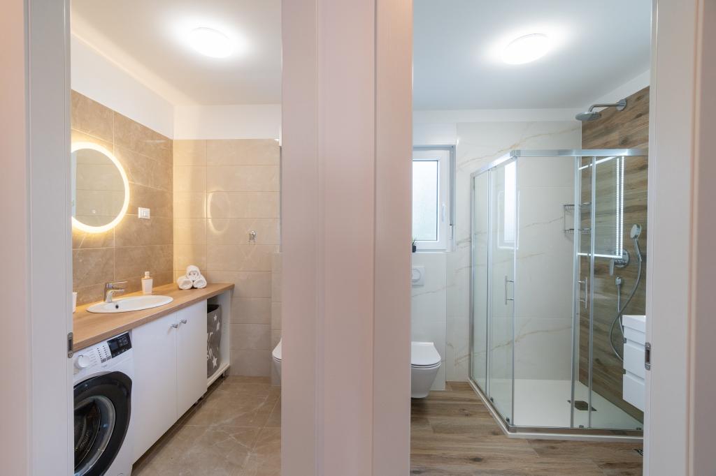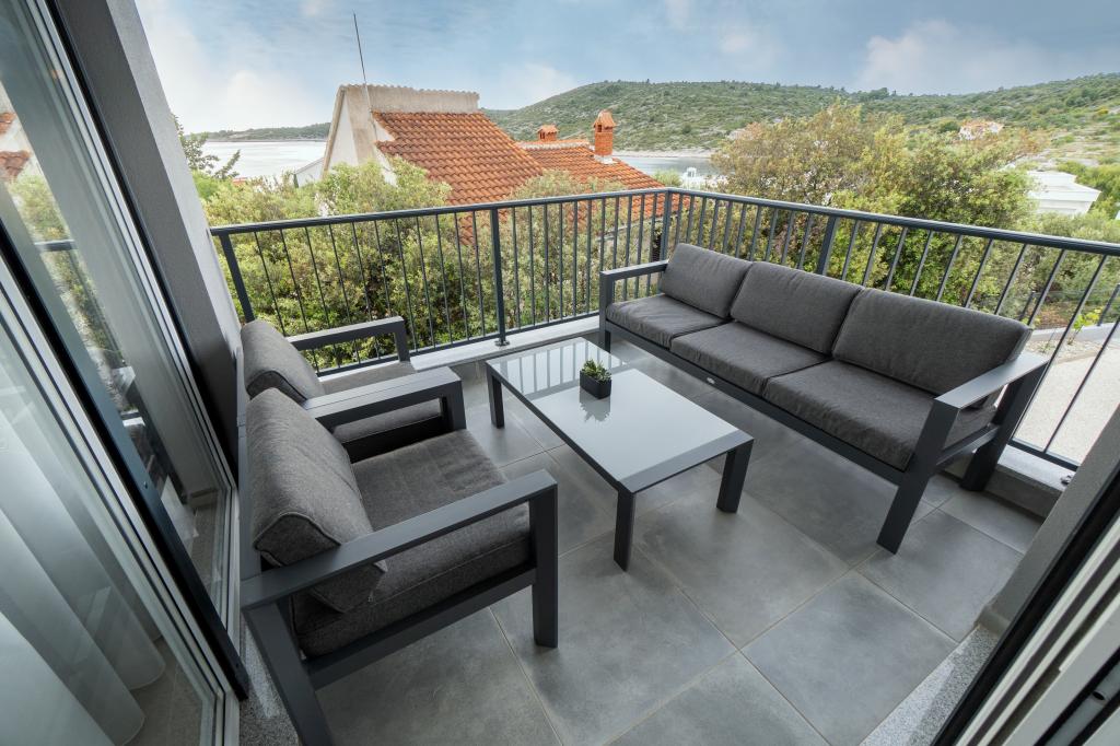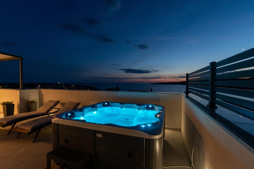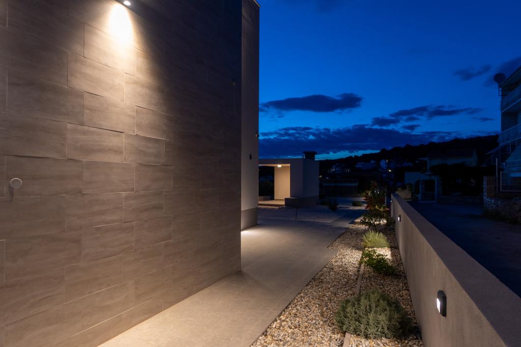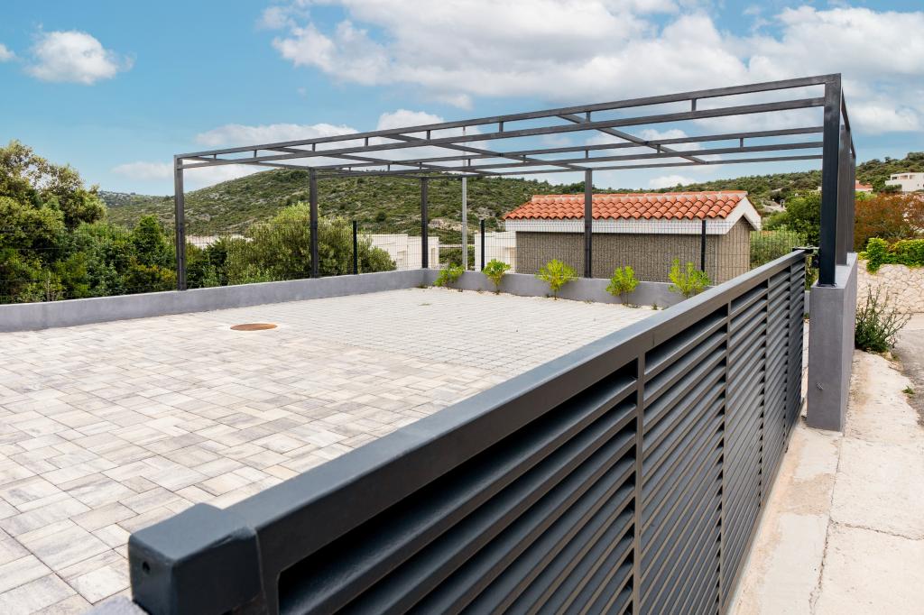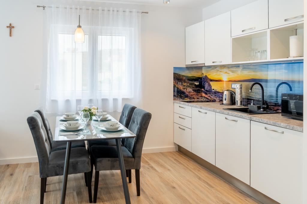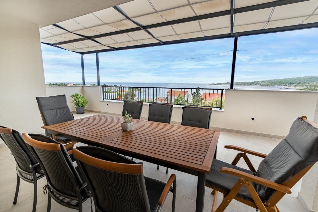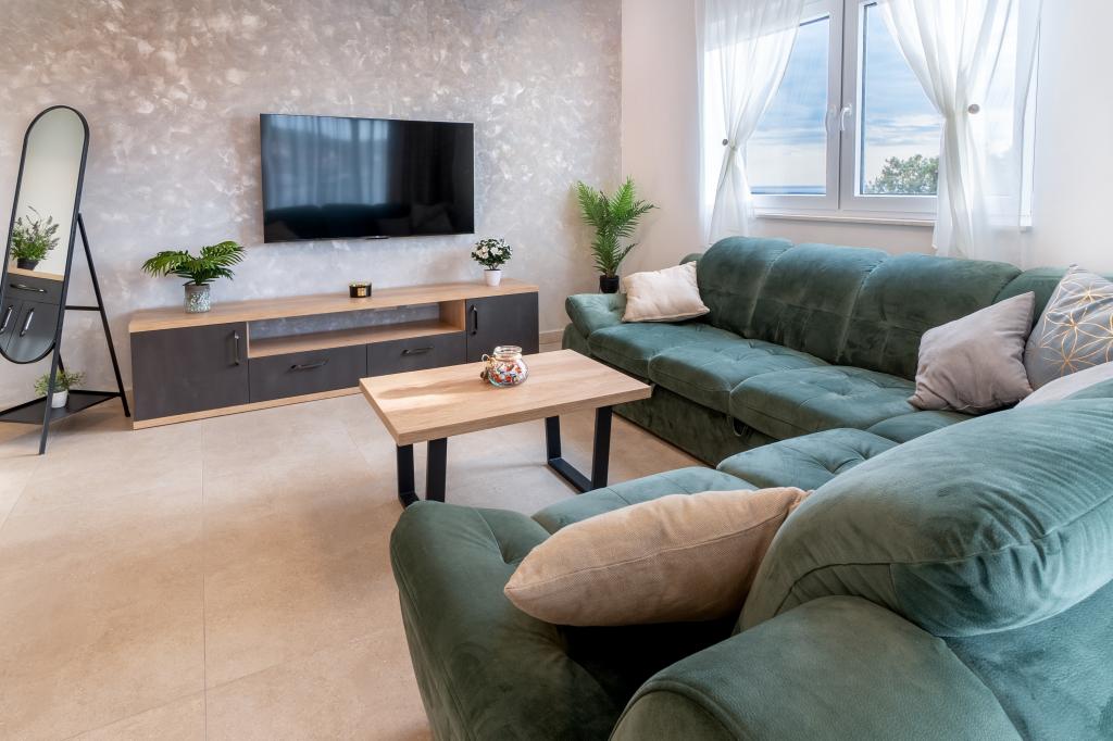 Neue Anlage. Genießen Sie mit Ihrer Familie diese moderne Unterkunft mit wunderschönen Sonnenuntergängen und Meerblick. Ruhige Nachbarschaft. Zwei Wohnungen, die als Ganzes vermietet werden. Im Erdgeschoss befindet sich ein Studio-Apartment bestehend aus einer Küche, einem Badezimmer und einem Zimmer mit einem Doppelbett, außerdem gibt es im Wohnzimmer ein Zustellbett. Im ersten Stock befindet sich eine große Wohnung bestehend aus einer Küche, einem Wohnzimmer, einem Balkon mit Gartenmöbeln ideal für den Morgenkaffee, zwei Zimmern mit einem Doppelbett und einem Zimmer mit zwei getrennten Betten, die bei Bedarf verbunden werden können. Dieses Apartment verfügt über zwei Badezimmer, von denen eines Teil des Zimmers ist, und eine Toilette. Im zweiten Stock des Gebäudes gibt es eine große Terrasse mit Blick auf den gesamten Ort und einer Hydromassagewanne für 5 Personen, Liegestühlen zum Sonnenbaden, Grill, Sommerküche sowie Tisch und Stühlen. Im Außenbereich gibt es auch eine kleinere überdachte Anlage mit Grill, Tisch und Bänken.
