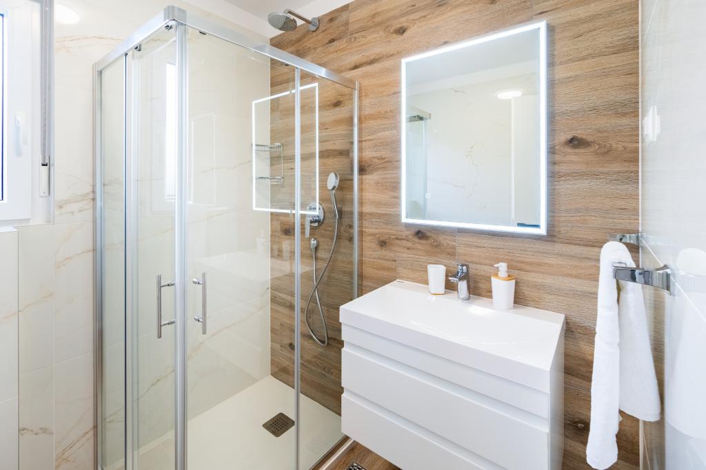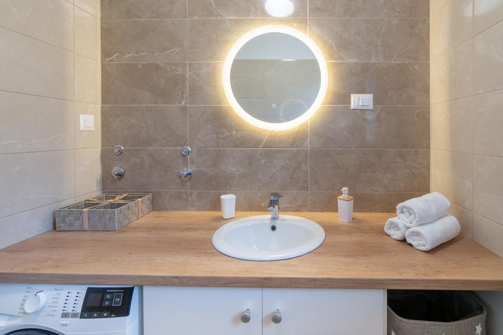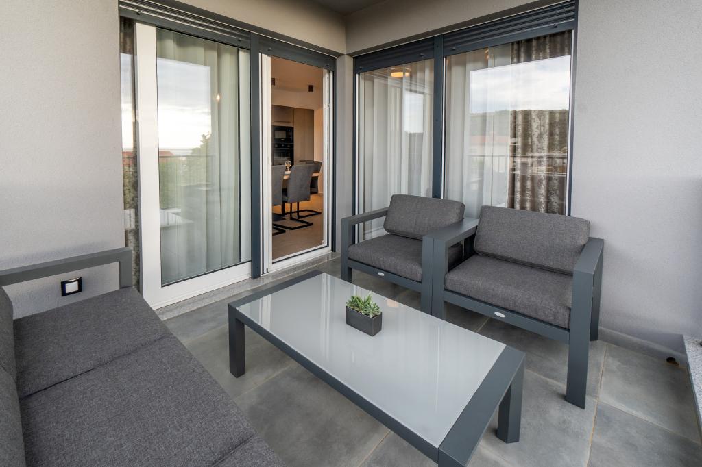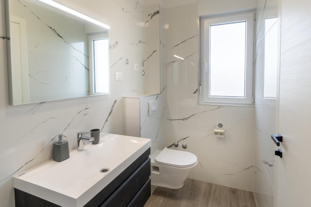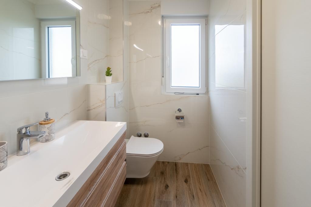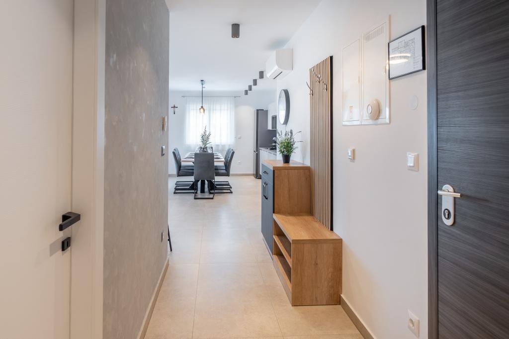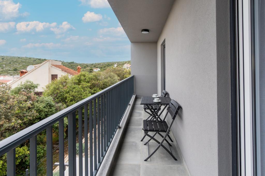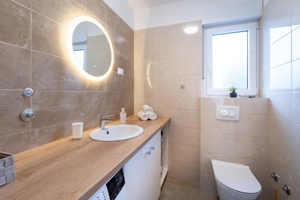 Neue Anlage. Genießen Sie mit Ihrer Familie diese moderne Unterkunft mit wunderschönen Sonnenuntergängen und Meerblick. Ruhige Nachbarschaft. Zwei Wohnungen, die als Ganzes vermietet werden. Im Erdgeschoss befindet sich ein Studio-Apartment bestehend aus einer Küche, einem Badezimmer und einem Zimmer mit einem Doppelbett, außerdem gibt es im Wohnzimmer ein Zustellbett. Im ersten Stock befindet sich eine große Wohnung bestehend aus einer Küche, einem Wohnzimmer, einem Balkon mit Gartenmöbeln ideal für den Morgenkaffee, zwei Zimmern mit einem Doppelbett und einem Zimmer mit zwei getrennten Betten, die bei Bedarf verbunden werden können. Dieses Apartment verfügt über zwei Badezimmer, von denen eines Teil des Zimmers ist, und eine Toilette. Im zweiten Stock des Gebäudes gibt es eine große Terrasse mit Blick auf den gesamten Ort und einer Hydromassagewanne für 5 Personen, Liegestühlen zum Sonnenbaden, Grill, Sommerküche sowie Tisch und Stühlen. Im Außenbereich gibt es auch eine kleinere überdachte Anlage mit Grill, Tisch und Bänken.