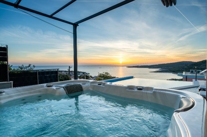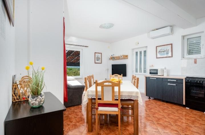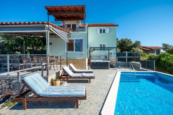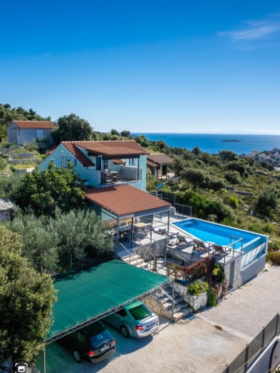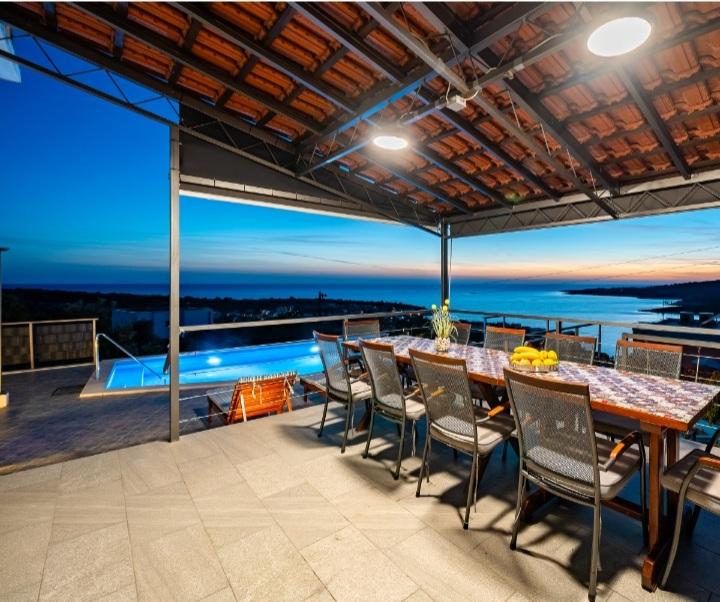 Das Ferienhaus mit Swimmingpool und beheizter Massagewanne liegt auf einem Hügel mit wunderschönem Blick auf das offene Meer. Es ist ideal für einen ruhigen Urlaub mit einer großen Familie oder einer Gruppe von Freunden. Gleichzeitig sind Sport- und Unterhaltungsmöglichkeiten leicht zugänglich; angelegte Radwege, Sand-, Beton- und Kiesstrände am kristallklaren Meer. Restaurants und Nachtclubs sind 5 bis 10 Autominuten entfernt. Das Haus verfügt über insgesamt zehn Betten und zwei Schlafsofas, zwei moderne Küchen, zwei Badezimmer und zwei Toiletten. Die Küchen sind mit Geschirr zur Zubereitung und Utensilien zum Servieren der Mahlzeiten ausgestattet. In einer Küche gibt es einen Geschirrspüler, eine Kaffeemaschine, eine Mikrowelle, einen Wasserkocher und einen Toaster. Den Gästen stehen zwei überdachte Terrassen, eine große offene Terrasse neben dem Pool, ein Grill, ein Parkplatz für drei Autos, ein Swimmingpool (40 m2), Liegestühle, eine Außendusche und ein umzäunter Spielplatz für Kinder zur Verfügung. Endreinigung, Klimaanlage, Poolpflege, Kurtaxe und Internet sind im Preis inbegriffen. Willkommen!