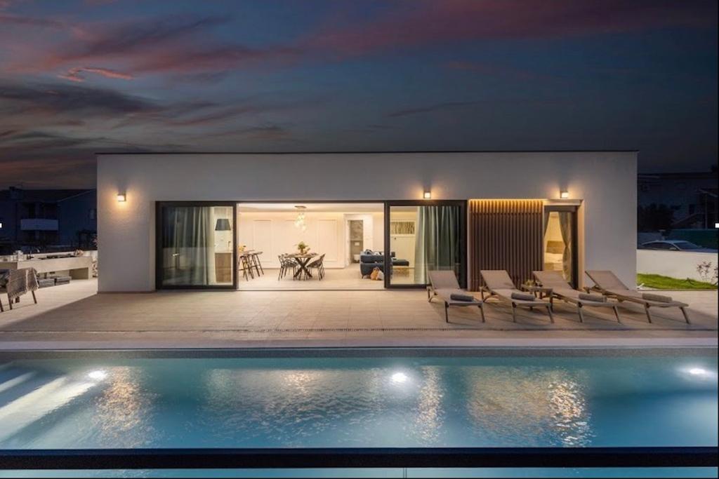 Die Villa Coralis befindet sich in Vrsi, nur 5 km von der Königsstadt Nin und 20 km von der Stadt Zadar entfernt. Diese moderne Schönheit wird Gäste anziehen, die einen luxuriösen und ruhigen Urlaub suchen und die gerne zusammen mit ihrer Familie oder Freunden Sonnenbaden, Schwimmen und Entspannen genießen. Vrsi ist ein kleiner Touristenort, der mit seinen modernen und schönen Villen und seiner Freundlichkeit Gäste aus aller Welt willkommen heißt. Sie werden es genießen, entlang der langen Kiesstrände zu spazieren, wo Sie die Sonne, das klare Meer und das Fitnessstudio im Freien genießen können. Die Villa Coralis wurde 2022 in einem zeitgenössischen Baustil erbaut, hat 130 m2 Wohnfläche, 45 m2 ist ein großer Swimmingpool und die Gesamtfläche des Grundstücks beträgt 450 m2. Die Villa ist voll klimatisiert und es können maximal 8 Personen darin übernachten, während die optimale Anzahl 6 Personen beträgt. Die Villa ist ein einstöckiges Haus und Sie werden bequem in 3 Schlafzimmern mit Doppelbetten untergebracht, die über ein eigenes Bad verfügen Badezimmer mit Dusche und ein zusätzliches Badezimmer. Es umfasst auch einen Kinderspielplatz, Tischtennis und PS4.