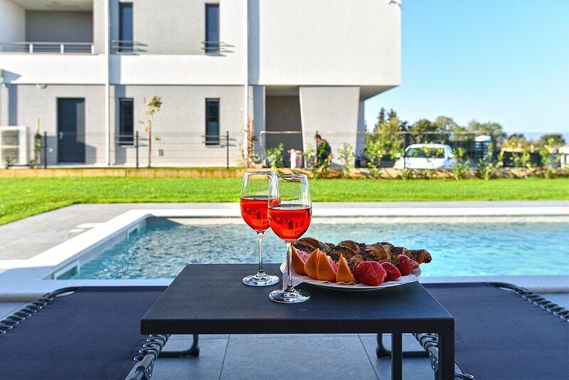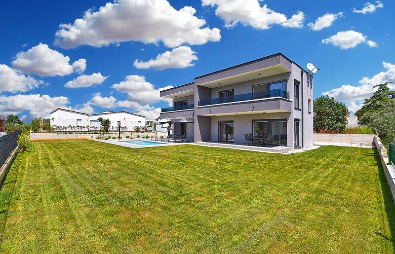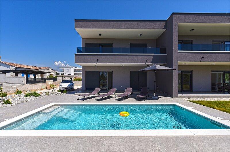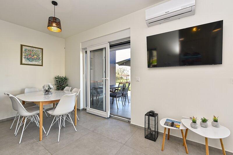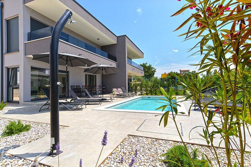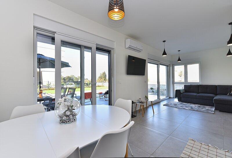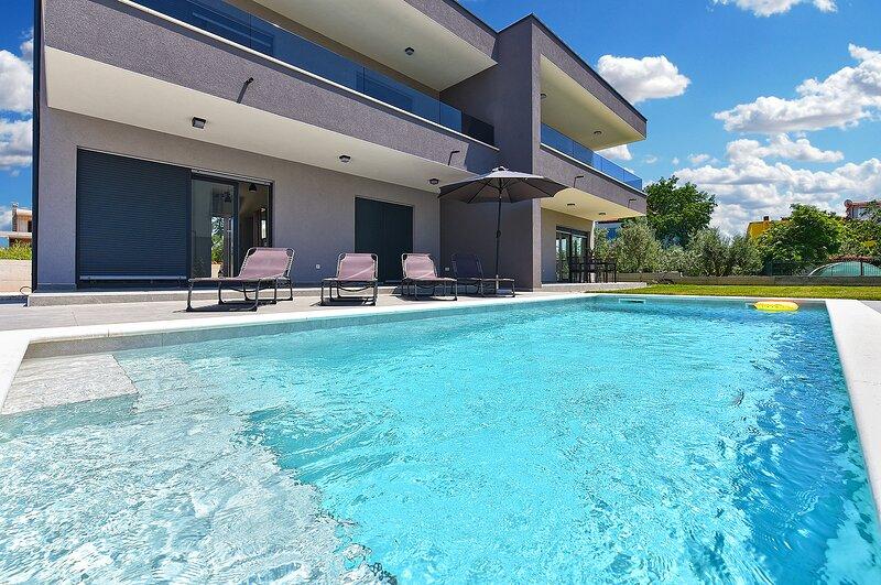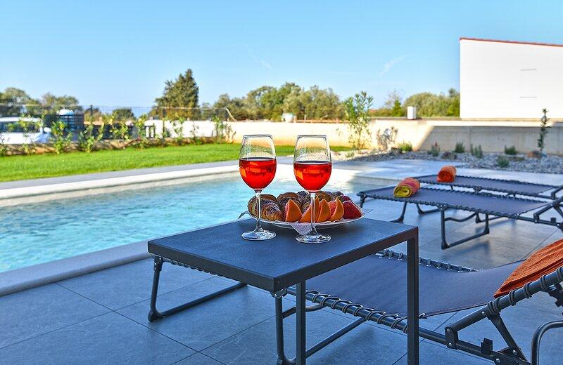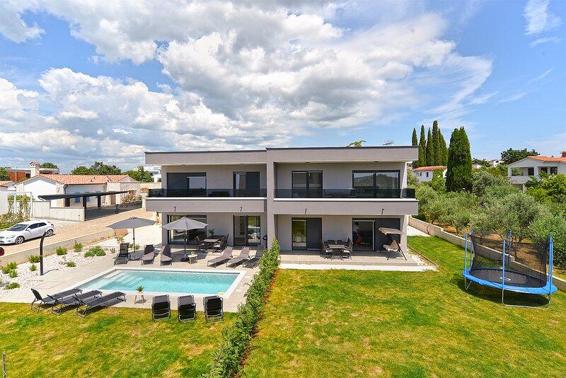 Die Villa Lippa mit Meerblick begrüßt Sie im ruhigen Dorf Peroj, in der Nähe von Pula und dem Nationalpark Brijuni. Diese modern gestaltete Villa ist perfekt für einen erholsamen Familienurlaub. Der Außenbereich lädt zum Erfrischen auf der überdachten Terrasse und zum Genießen des beheizten Pools im Sommer und in der Vorsaison ein. Die Villa bietet komfortable Unterkunft für bis zu 12 Personen in 4 Schlafzimmern. Die Villa Lippa Peroj begrüßt Sie mit einer Platte mit istrischen Fleischspezialitäten und frisch gegrilltem Fisch – siehe die Kategorie „Zusätzliche Bilder“. Die Villa Lippa in Peroj, in der Nähe von Pula und dem bezaubernden Nationalpark Brijuni, ist eine moderne und wunderschön gestaltete Villa, die den perfekten Rahmen für einen erholsamen Familienurlaub mit herrlichem Blick auf die Adria bietet. Komfort und Stil für die ganze Familie Die Villa Lippa wurde konzipiert, um bis zu 12 Gästen maximalen Komfort und Entspannung zu bieten. Mit ihrem zeitgenössischen Design und den sorgfältig ausgewählten Annehmlichkeiten ist sie ideal für Familien oder Gruppen von Freunden, die eine ruhige Umgebung genießen möchten.