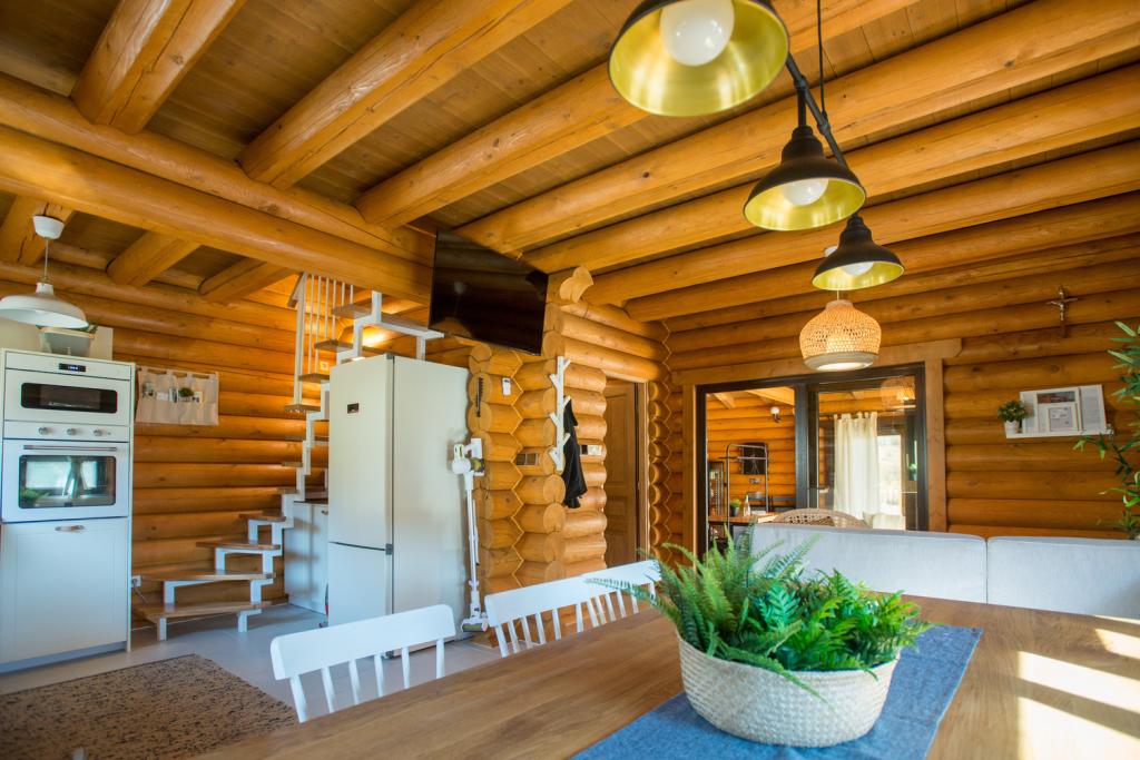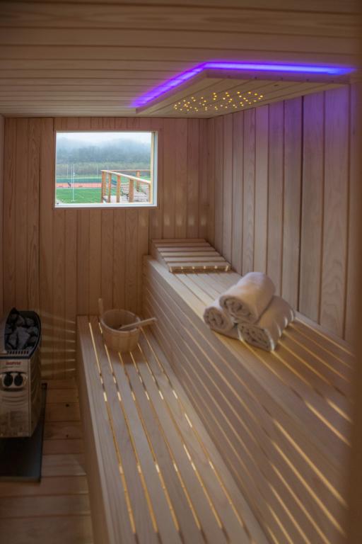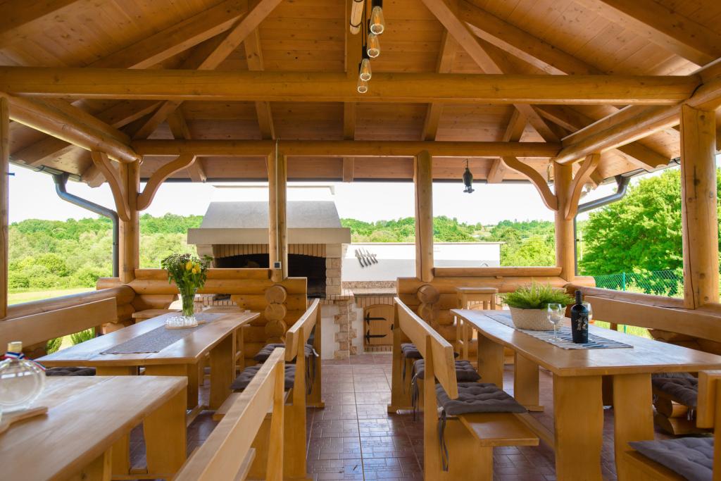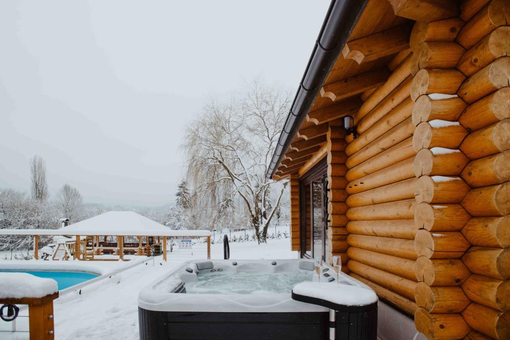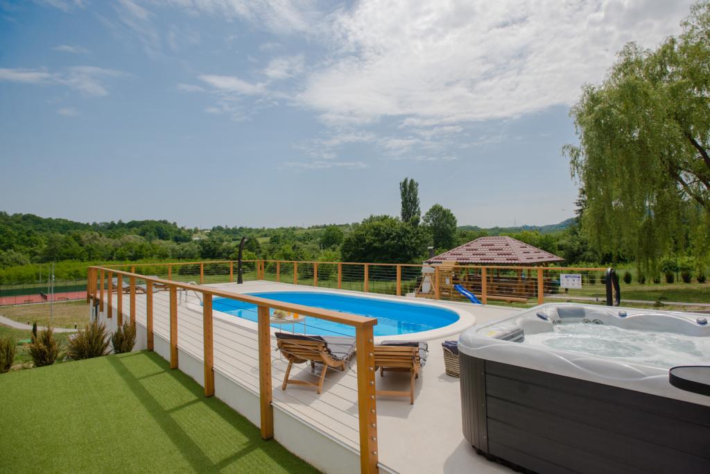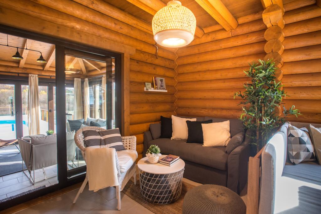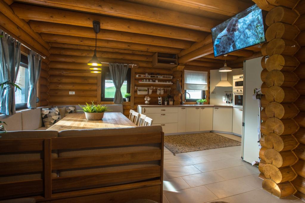 Holzhaus aus sibirischer Kiefer. Haus: max. Betten 10, Haus 108 m2, Terrasse mit Pool 105 m2, Sauna, Whirlpool, Pavillon 30 m2. Garten über 7.000 m2, Parkplatz, Wohnzimmer mit Küche, 3 Schlafzimmer, Badezimmer mit Dusche und WC. Geschlossene Terrasse mit Kamin, Tennisplatz für Geselligkeit und Sport, Umkleideraum mit Dusche und WC, Pavillon mit Grill, Angelrute und notwendiger Ausrüstung. Kinderspielplatz, 4 Fernseher, Dart.