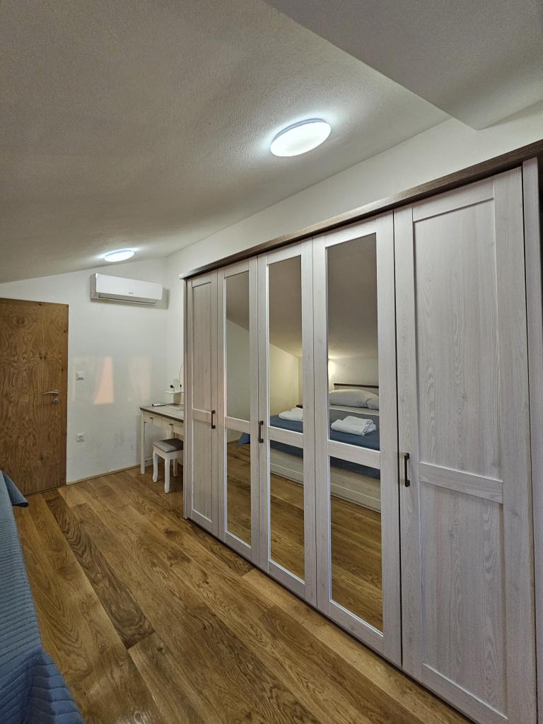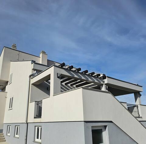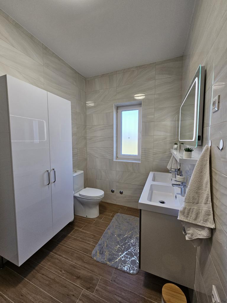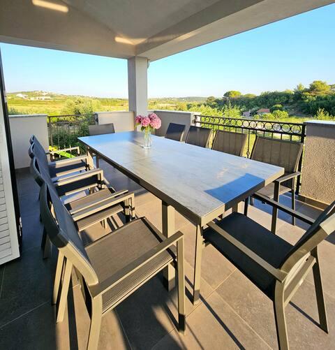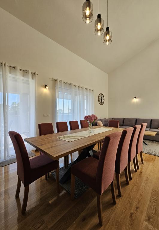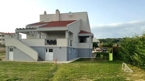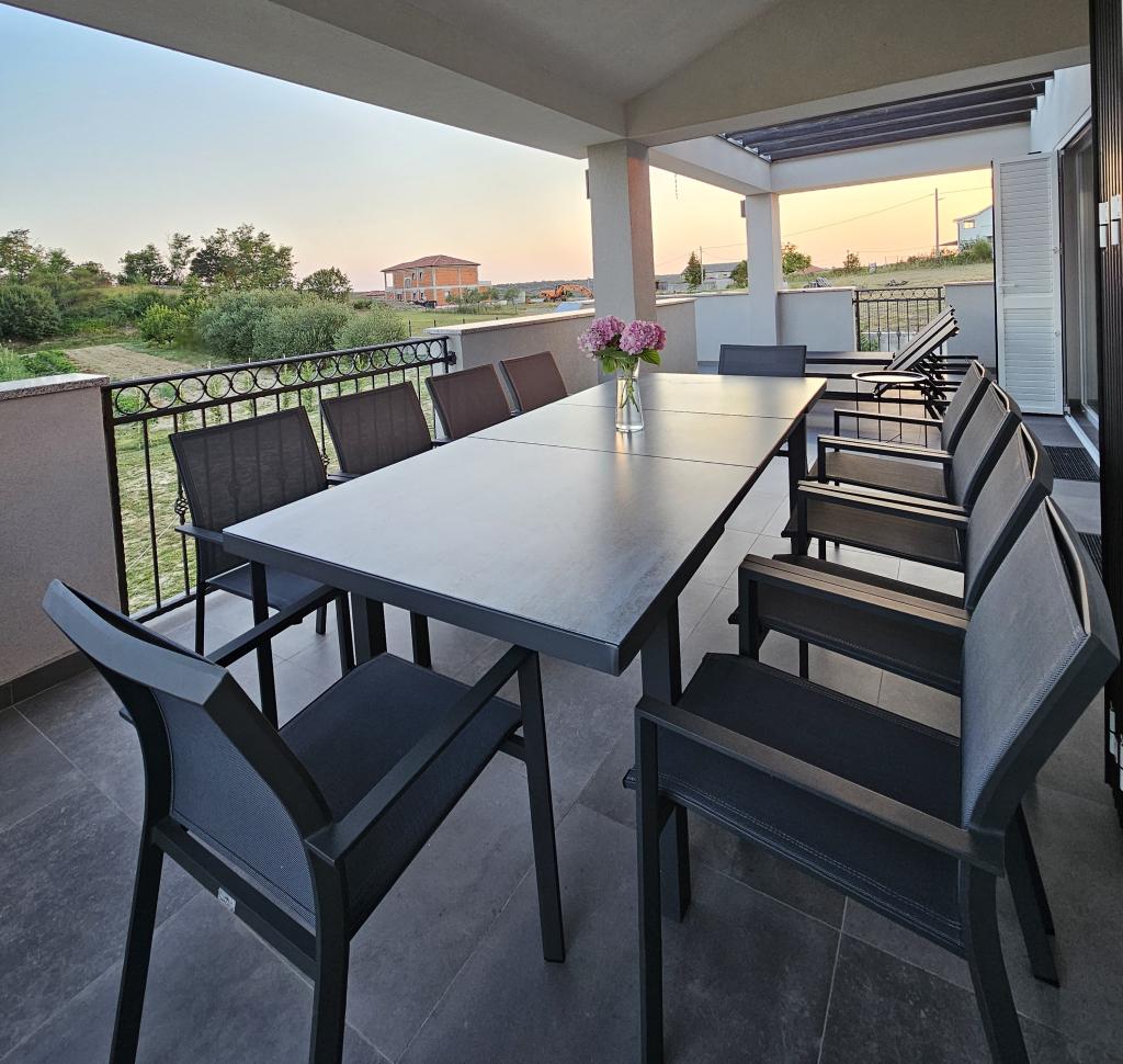 Willkommen in Ihrem 324 m² großen Ferienhaus für Familien in der Nähe von Zadar – ein geräumiges Haus, das zum Entspannen und Genießen einlädt. Eltern können im privaten Whirlpool relaxen oder sich im voll ausgestatteten Fitnessraum austoben, während die Kinder sich auf ihrem sicheren Spielplatz im Freien vergnügen. Das Haus bietet bequem Platz für bis zu 10 Gäste und verfügt über fünf liebevoll eingerichtete Schlafzimmer, drei moderne Badezimmer, zwei voll ausgestattete Küchen, einen Essbereich und ein helles Wohnzimmer mit Fernseher. Ein separater Arbeitsbereich und eine Waschküche sorgen für zusätzlichen Komfort bei längeren Aufenthalten. Der komplett umzäunte Garten bietet Privatsphäre und Sicherheit und ist ideal für Familien mit Kindern. Das Highlight des Hauses ist der Außenbereich: Zwei Balkone mit Sonnenliegen, eine große Terrasse mit Grill, ein großzügiger Essbereich im Freien und eine einladende Liegewiese laden zum Verweilen an lauen dalmatinischen Abenden ein. Kostenlose Privatparkplätze stehen Ihnen vor Ort zur Verfügung.