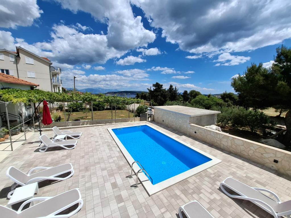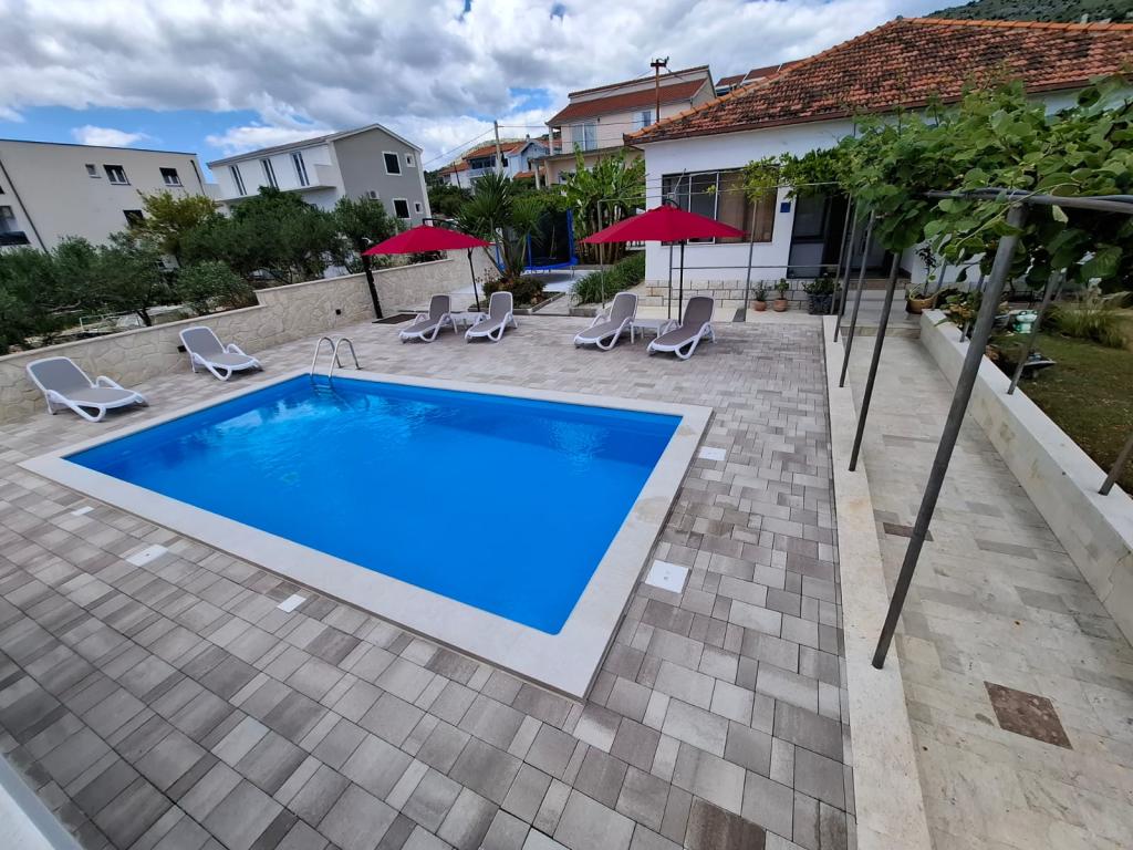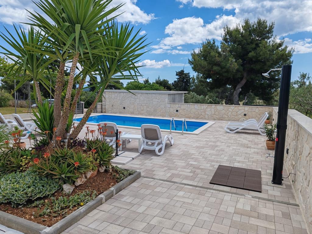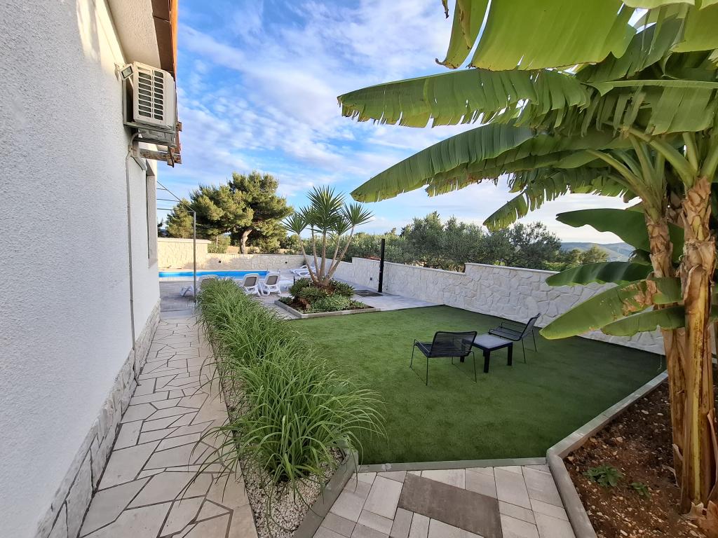 Dieses neu renovierte Familienhaus für 7 Personen liegt in der Nähe von Trogir, im Bezirk Seget Donji, in der Nähe des Hotels Medena. Das Haus liegt auf einem 700 m2 großen Grundstück und verfügt über 150 m2 Wohnfläche. Eine Außenküche mit einem Tisch für 8 Personen, eine Außentoilette, ein großer Grill und ein privater Swimmingpool bieten Ihnen alles, was Sie für einen angenehmen und erholsamen Urlaub brauchen. Der gesamte Bereich ist modern eingerichtet, klimatisiert und verfügt über WLAN. Die innenliegende Küche ist komplett eingerichtet und verfügt über sämtliche Haushaltsgeräte. Das Haus verfügt über 3 modern eingerichtete, große Schlafzimmer. Jedes Schlafzimmer verfügt über Sat-TV und Klimaanlage. Das größere Badezimmer verfügt über eine Badewanne und eine Waschmaschine. Das kleinere Badezimmer verfügt über eine Duschkabine. Außerdem gibt es im Haus einen kleinen Fitnessraum. Vor dem Haus gibt es Parkplätze für 3 Autos. Der große Verandagarten bietet Ihnen Ruhe und Entspannung und die Außenküche ist ein Ort, um die Zeit mit Familie und Freunden zu genießen. Den Gästen steht das gesamte Haus und der Garten mit Swimmingpool zur Verfügung.