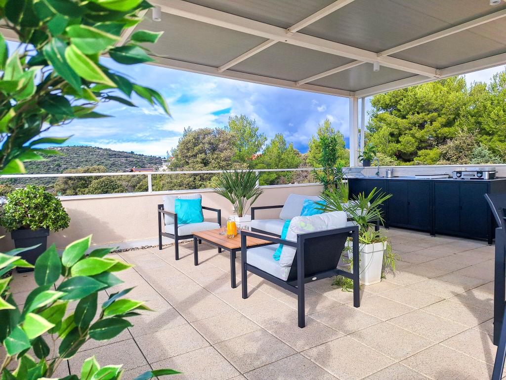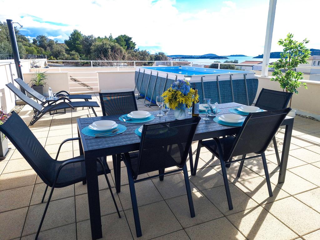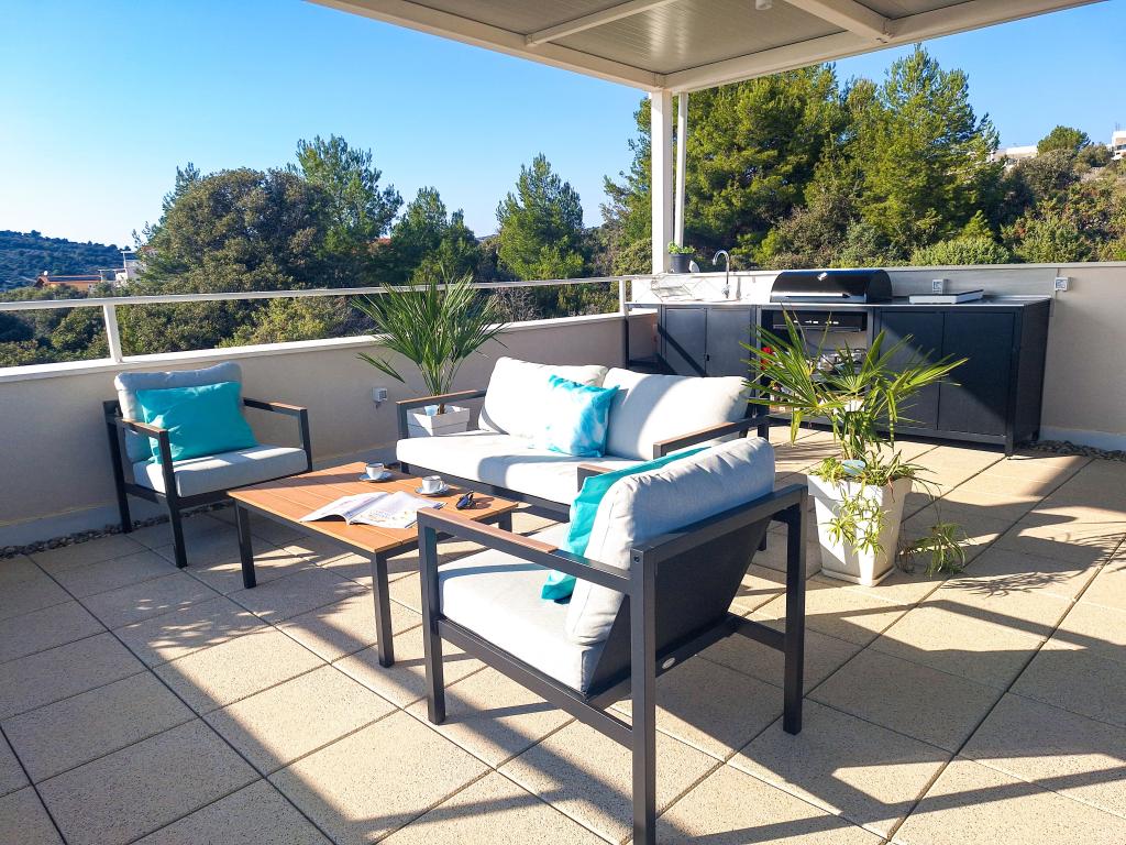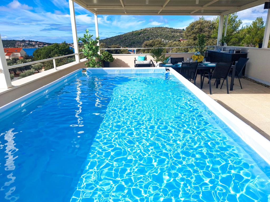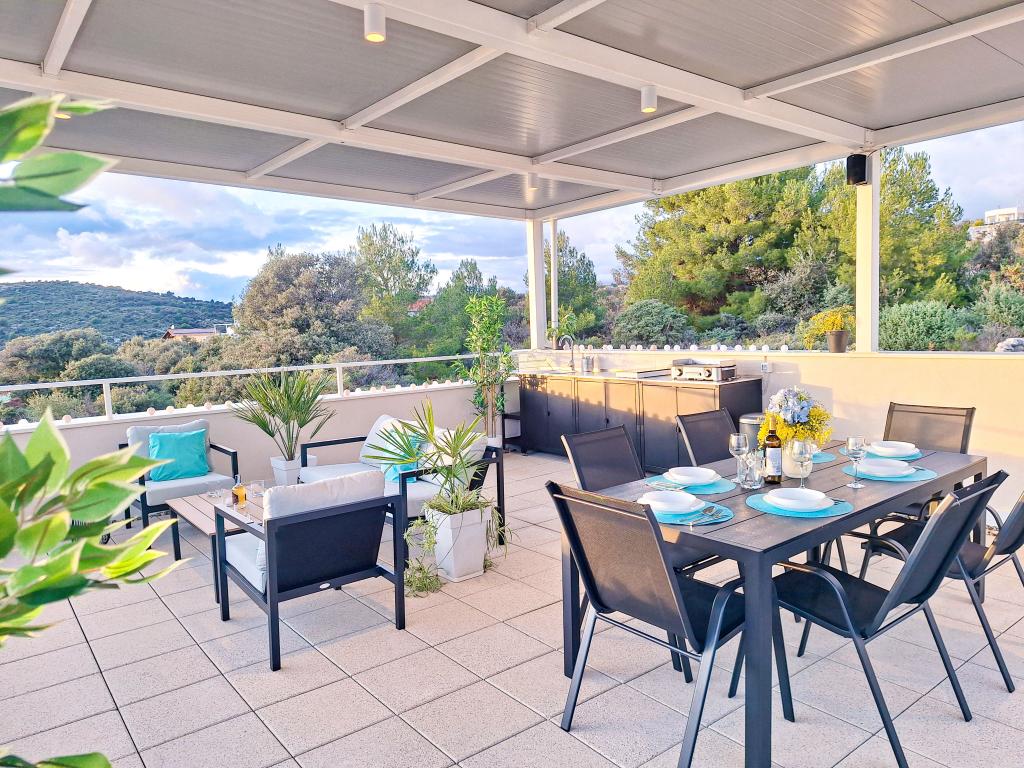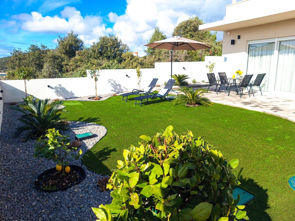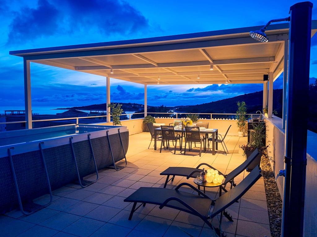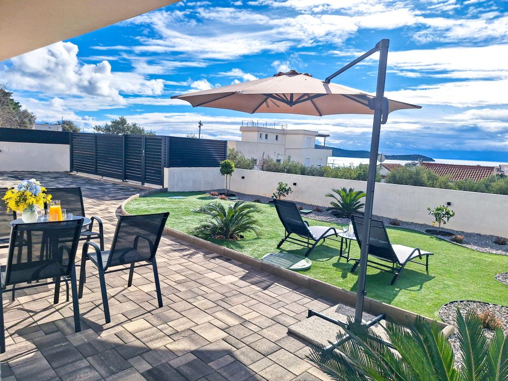 Willkommen in Tesa, einer neuen, modernen Villa, in der Sie sich mit Ihrer Familie oder Ihren Freunden rundum wohlfühlen können. Diese elegante Villa für bis zu 6 Gäste bietet eine voll ausgestattete Küche, ein modernes Badezimmer mit ebenerdiger Dusche und Waschtrockner sowie Klimaanlage und einen Fernseher in jedem Zimmer. Die Dachterrasse mit Blick auf das Meer und die Inseln verfügt über einen beheizten Pool, eine Außendusche und Sonnenliegen – ideal zum Entspannen tagsüber mit einem guten Buch oder Musik aus den Außenlautsprechern und abends zum Genießen unter dem Sternenhimmel mit einem Glas Ihres Lieblingsgetränks. Die Terrasse mit voll ausgestatteter Küche (Grill, Herd, Kühlschrank), Esstisch und Sitzecke lädt dazu ein, den ganzen Tag im Freien zu verbringen. Kochen mit einer leichten Meeresbrise macht dieses Erlebnis besonders angenehm. Die perfekte, zentrale Lage mit allen Annehmlichkeiten des täglichen Bedarfs und wunderschönen Stränden nur 200 Meter entfernt, umgeben von viel Grün und einem liebevoll angelegten Garten zum Entspannen, garantiert Ihnen einen unvergesslichen Urlaub.