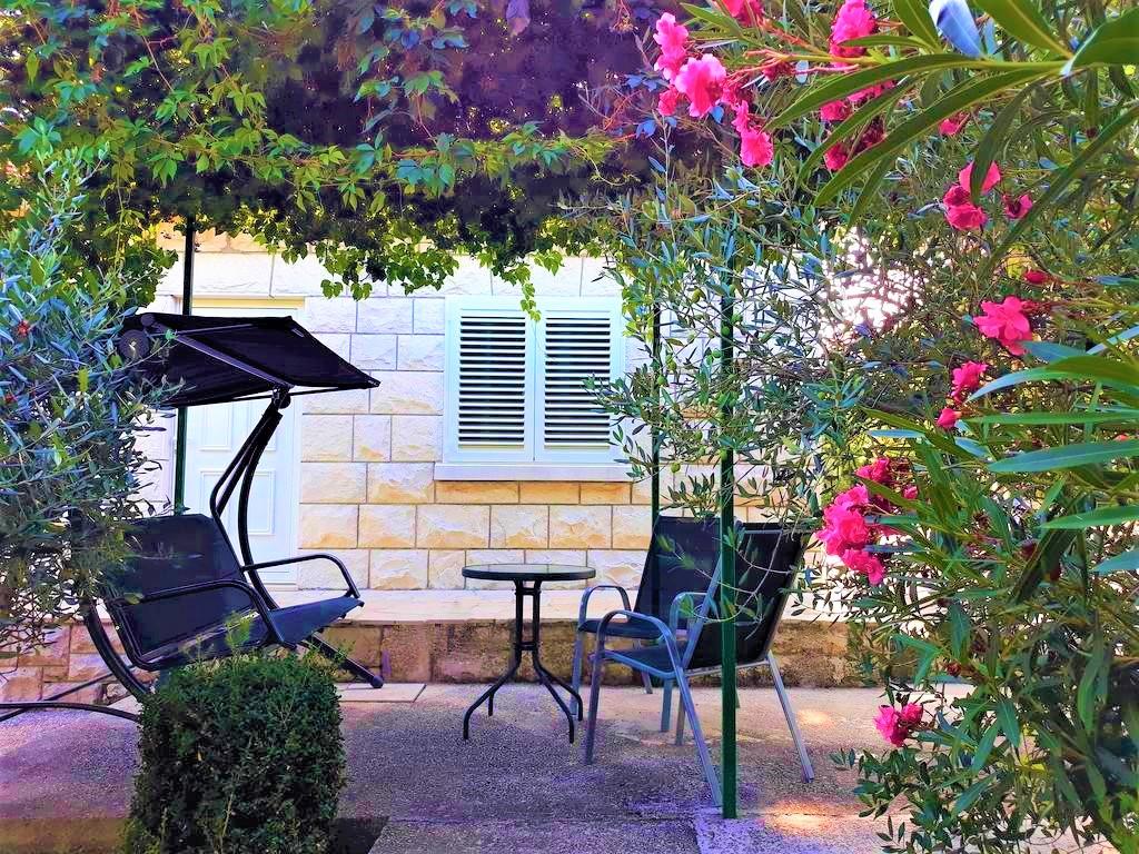 Haus Nikola befindet sich in einem ruhigen Teil der Stadt neben einem Pinienwald entlang der Promenade von Sumartin. Es liegt 40 m vom Natursteinstrand südlich des Hauses und 80 m vom schönsten Natursandstrand (im Bild) im östlichen Teil von Brac entfernt. Das Haus hat einen großen Garten von 800m2, wo Sie auf Liegestühlen entspannen und grillen können. Der Garten ist von viel Grün geschützt und bietet absolute Intimität und den richtigen Ort für einen Familienurlaub. Es wird als ganzes Haus vermietet, man ist alleine im Haus, es gibt keine anderen Gäste.