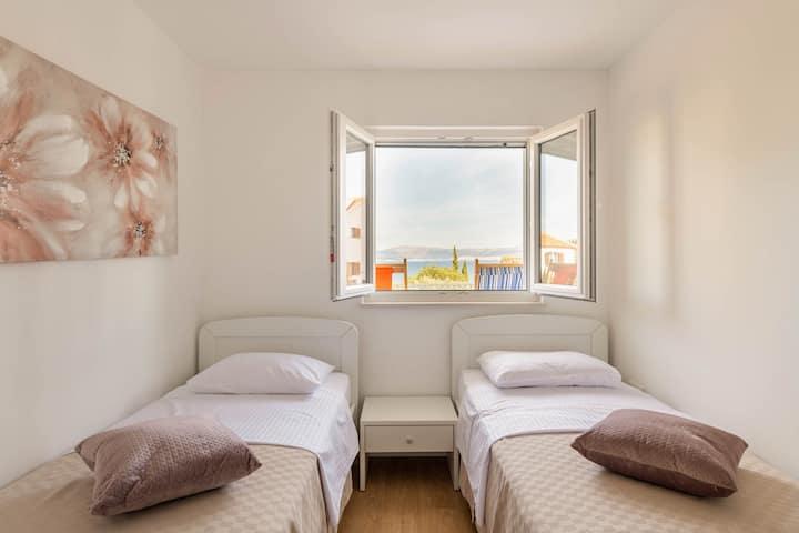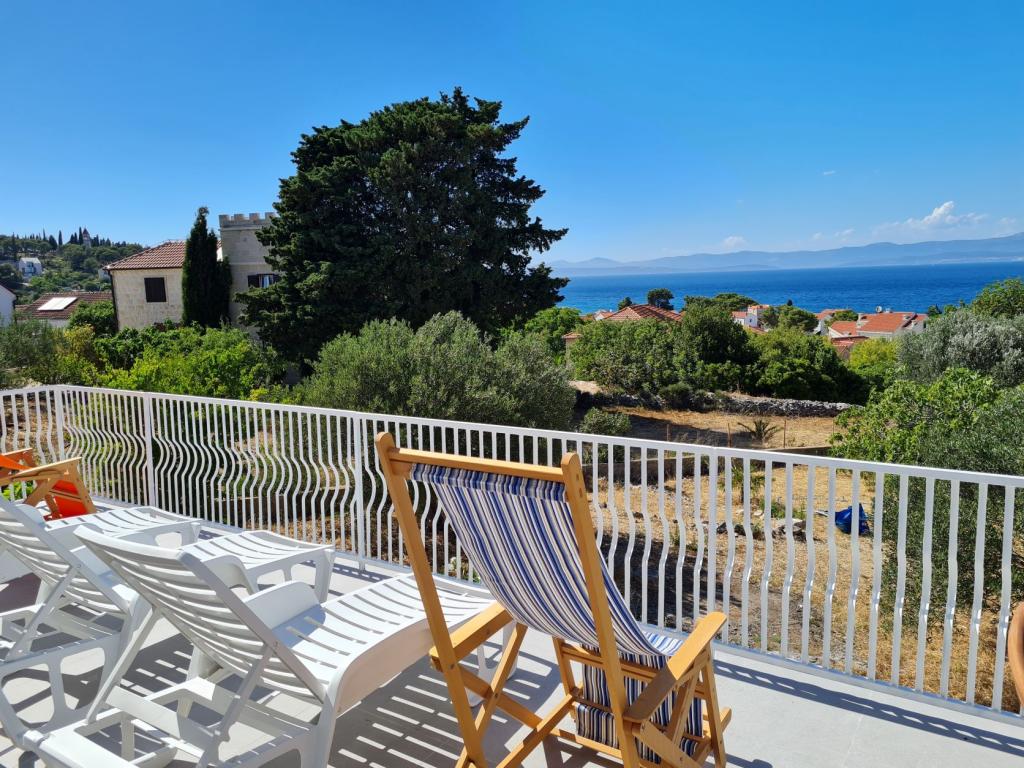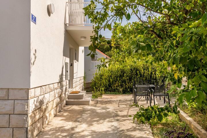 Neu renoviertes Ferienhaus im Zentrum von Sutivan, nur wenige Minuten vom Strand entfernt mit wunderschönem Blick auf das Meer. Das Gartenhaus Sutivan befindet sich auf einem 800 m² großen Grundstück mit einem weitläufigen mediterranen Garten und bietet Platz für 8+1 Gäste in 4 Schlafzimmern. Das Erdgeschoss wird dominiert von einem großen offenen Wohn-/Esszimmer mit Kamin für kühlere Nächte und einer voll ausgestatteten Küche mit Backofen und Geschirrspüler. Vom Wohnzimmer aus haben Sie Zugang zur Essterrasse im Freien mit Blick auf das Meer und Liegestühlen. Auf der gleichen Etage gibt es ein Schlafzimmer mit zwei getrennten Betten und ein Badezimmer mit Dusche. Die Treppe führt in die obere Etage mit drei Schlafzimmern (zwei mit Doppelbetten und Balkon, eines mit zwei Einzelbetten) und zwei Badezimmern. Im Keller gibt es einen Kickertisch und eine Konsole sowie ein zusätzliches Badezimmer mit Waschmaschine. Parkplatz für zwei Fahrzeuge direkt neben dem Hauseingang, draußen gibt es einen traditionellen Grill mit zusätzlichem Tisch und Stühlen. Im Garten gibt es Olivenbäume und einen großen Feigenbaum, Zugang zum Strand durch den Garten.
