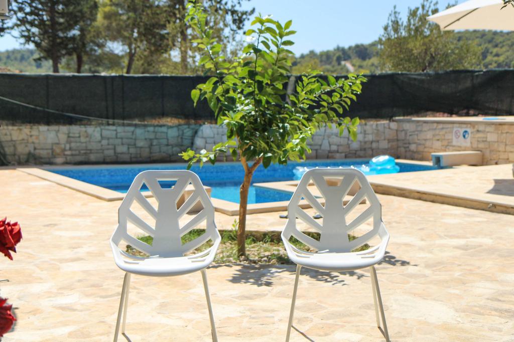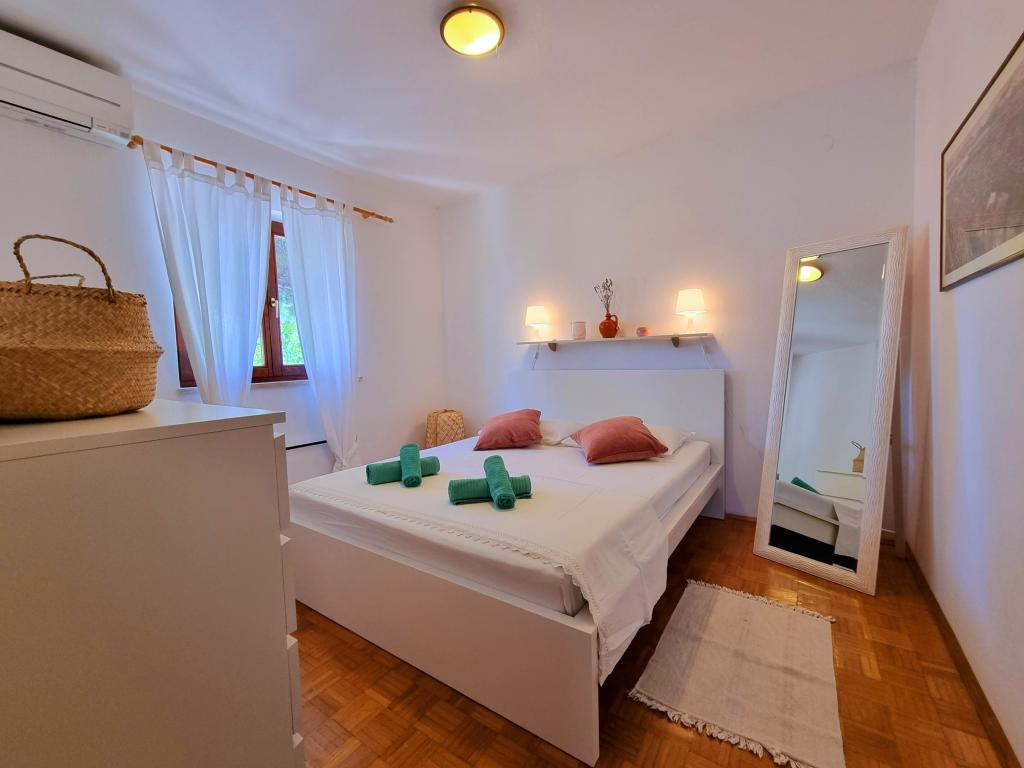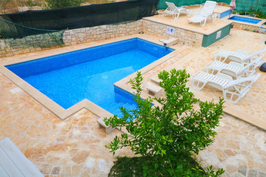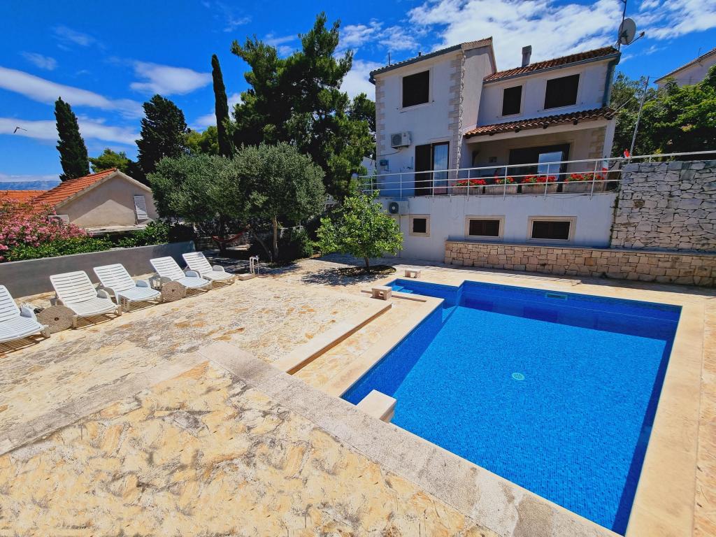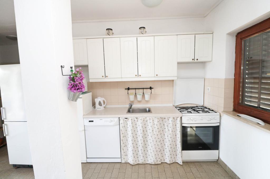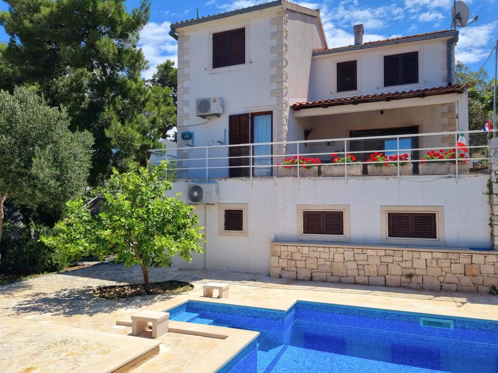 Die Villa Dvornik bietet absolute Privatsphäre in einer komfortablen Unterkunft für Familien mit Kindern, Studentengruppen und Familientreffen mehrerer Generationen. Es hat einen Blick auf das Meer und ist nur 300 Meter vom Meer und dem Strand entfernt. Wohnfläche von 110 m2 + 25 m2 Terrasse, große Gartenfläche von 280 m2 mit Steinplatten bedeckt, mit 4 Zimmern (8 Betten) und zwei Swimmingpools. Ein großes Becken mit 4 Massagedüsen von 24 m2 und einer Tiefe von 1,5 m für Erwachsene und ein kleineres Becken für Kleinkinder mit einer Größe von 3,5 m2 und einer Tiefe von 0,5 m. Beide Becken werden mit 10 m2 großen Sonnenkollektoren beheizt, die es ermöglichen die Temperatur des Pools von 21 °C im Mai und Oktober. Die Außendusche und der Grill befinden sich in der Umgebung des Hauses. Das Haus ist klimatisiert und hat Zugang zu drahtlosem Internet. Drei Parkplätze stehen auf dem Grundstück rund um das Haus zur Verfügung. Haustiere sind willkommen.