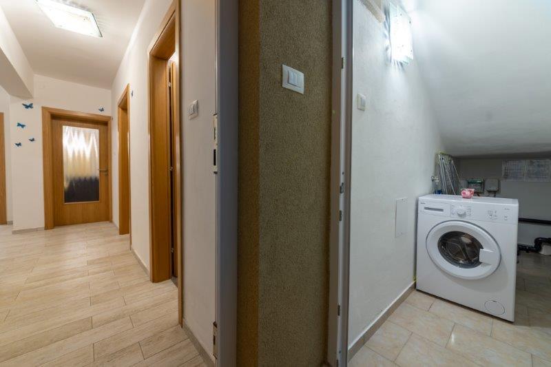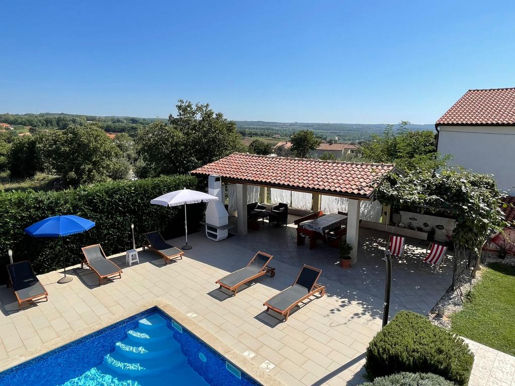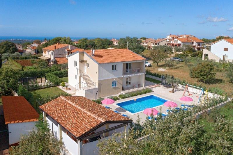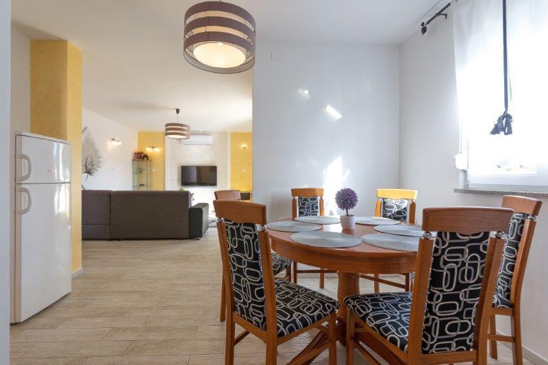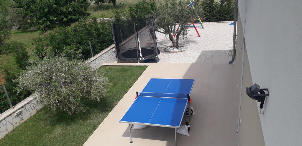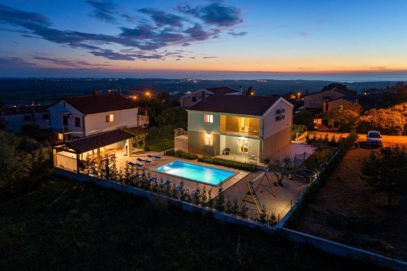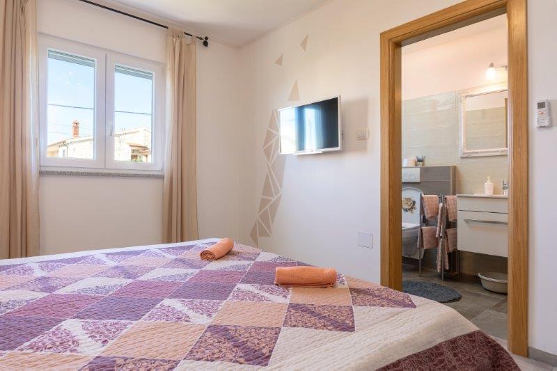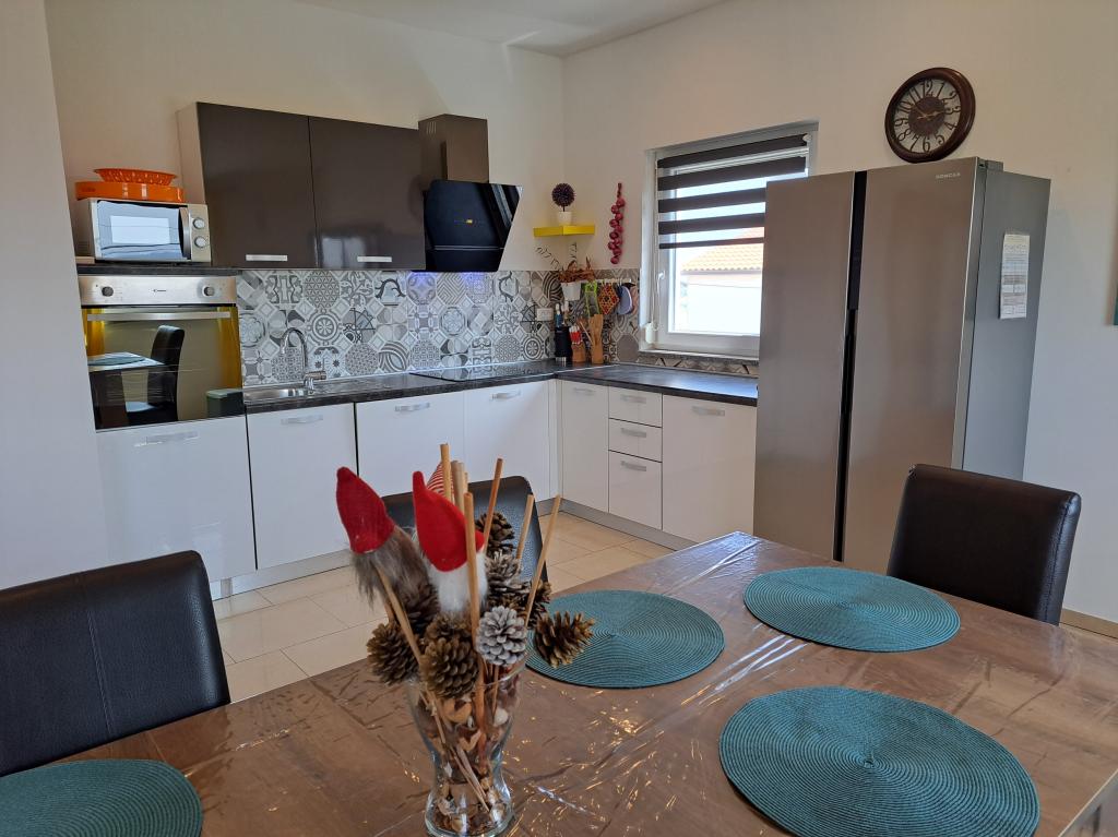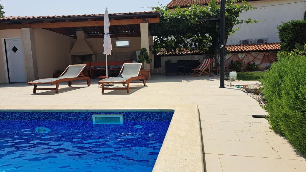 Wir befinden uns in der kleinen Stadt Kaštelir, 10 km von Poreč entfernt. Das Haus besteht aus zwei separaten Wohnungen, eine im Erdgeschoss, die andere im ersten Stock, das Haus wird als Ganzes vermietet. Jede Wohnung besteht aus einem Wohnzimmer, einer Küche und zwei Schlafzimmern mit jeweils eigenem Bad. Jede Wohnung verfügt über 3 Klimaanlagen, eine im Wohnzimmer und eine in jedem Zimmer. Die Wohnung ist mit allem ausgestattet, was für einen angenehmen Aufenthalt notwendig ist. Im Außenbereich gibt es einen Kinderspielplatz mit Schaukeln, Trampolin und Tischtennisplatte. Der Hof ist komplett eingezäunt, daher können Sie Ihren Hund gerne mitbringen, wir erheben für Hunde eine Gebühr von 12 Euro pro Tag. Im Außenbereich verfügen wir zusätzlich über einen 8x4m Swimmingpool, Sonnenliegen, Sonnenschirme und eine Sommerküche mit Grill. Vor der Wohnung haben wir 6 Parkplätze, davon 2 überdacht. Aufgrund anderer Verpflichtungen bei uns sind im Juli und August Buchungen nur von Sonntag bis Sonntag möglich, in den übrigen Monaten beträgt die Mindestaufenthaltsdauer 5 Tage und die Ankunftszeit kann an jedem beliebigen Wochentag erfolgen. Das Haus ist ideal für 8 Personen, bietet aber auch Platz für 10 Personen. Für eine weitere Person berechnen wir eine Gebühr v