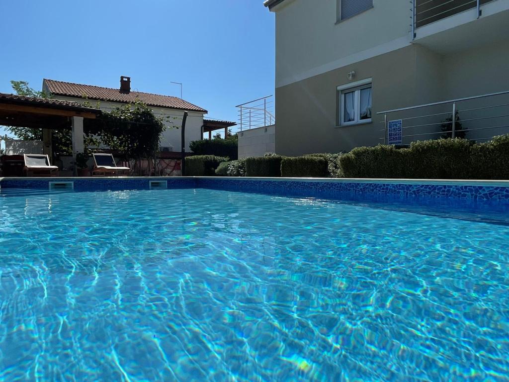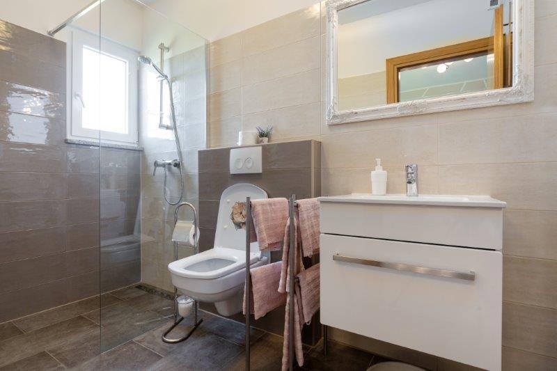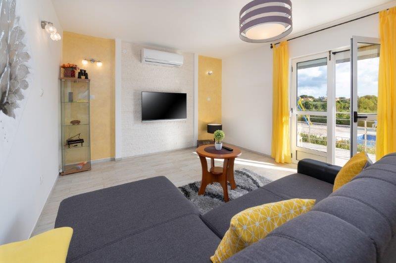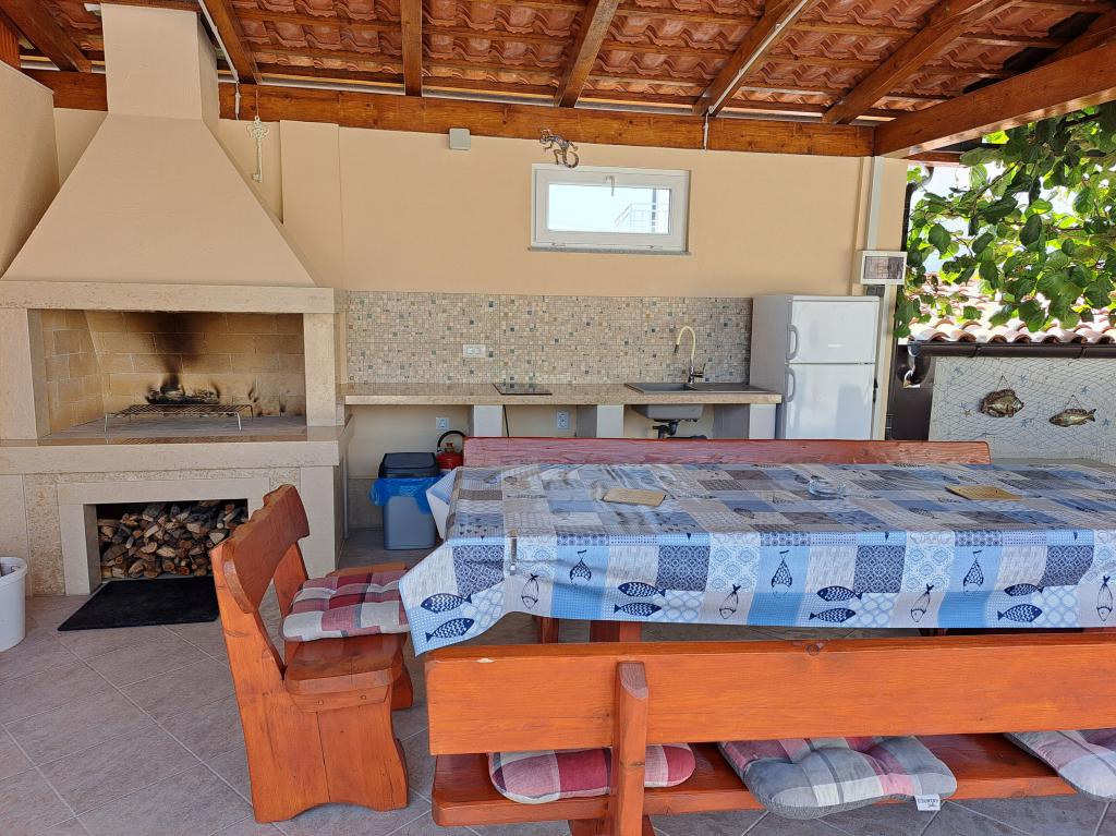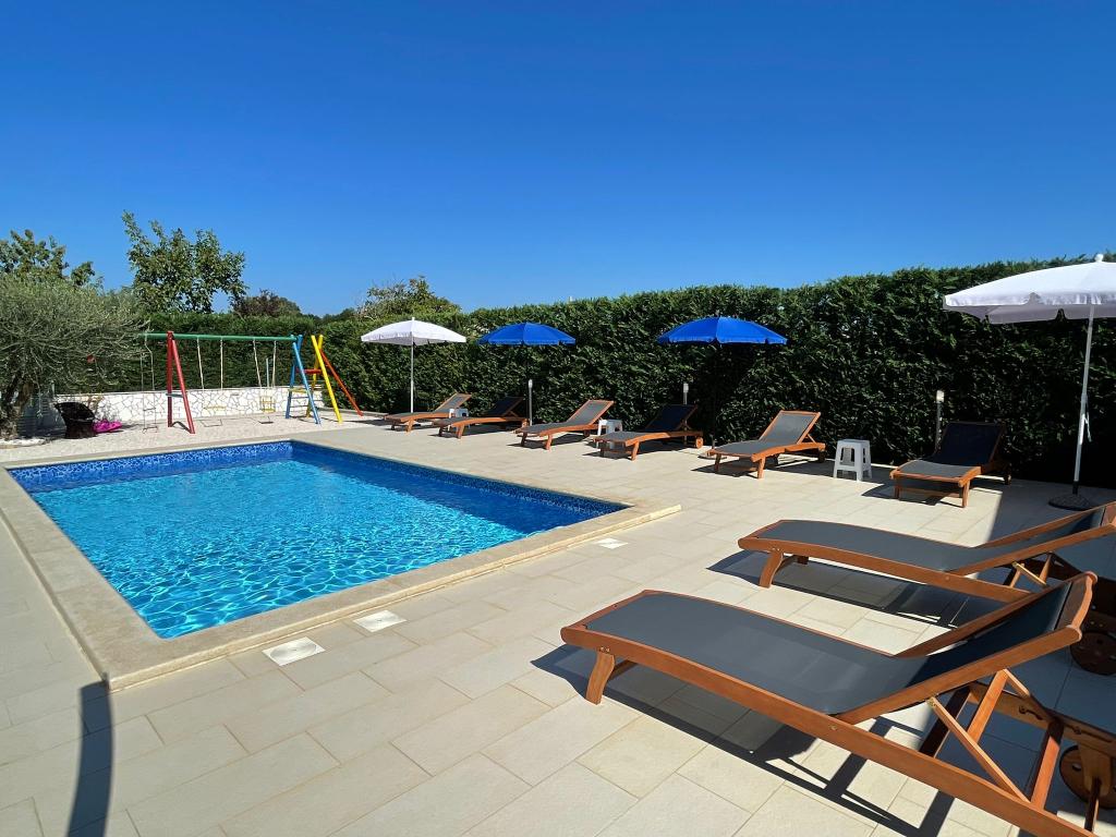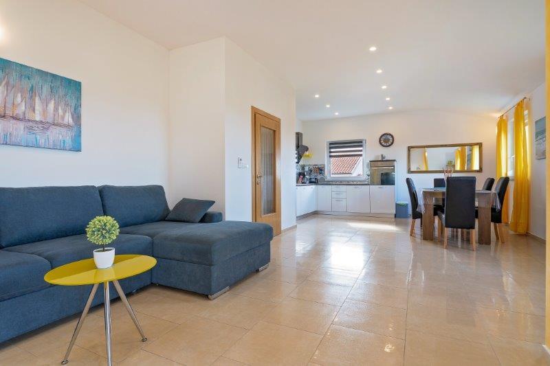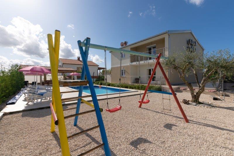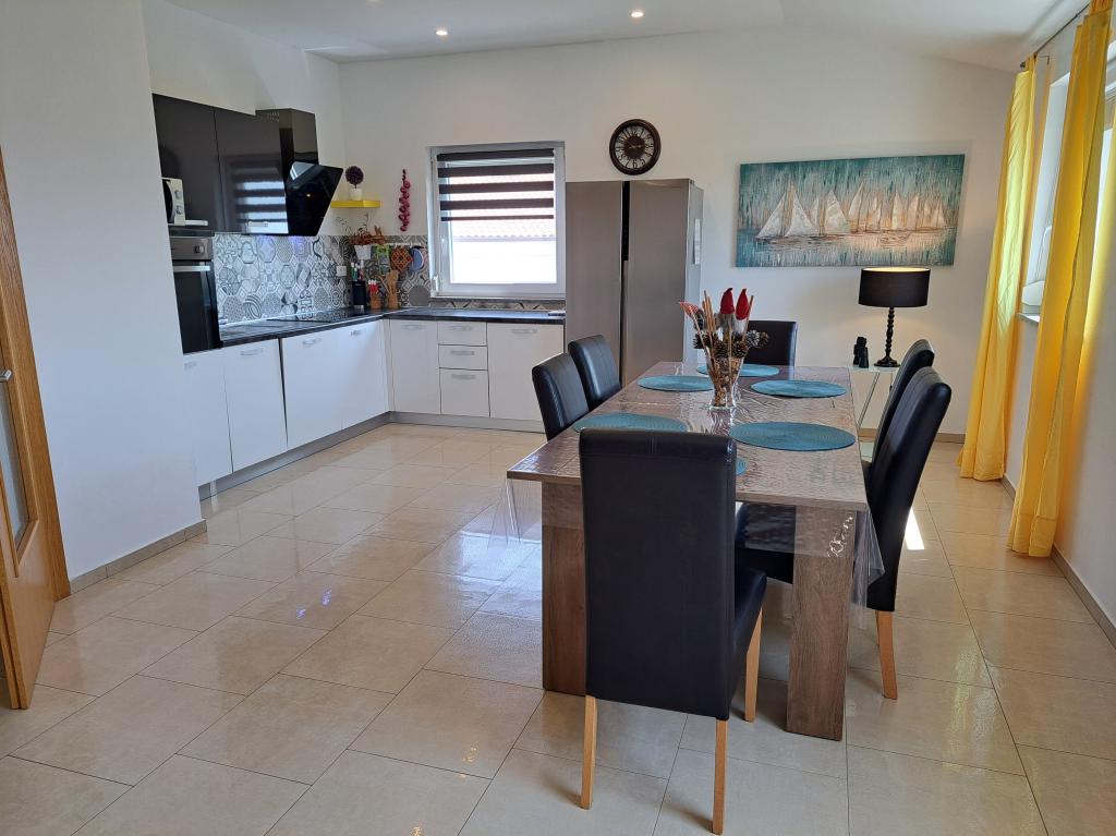 Wir befinden uns in der kleinen Stadt Kaštelir, 10 km von Poreč entfernt. Das Haus besteht aus zwei separaten Wohnungen, eine im Erdgeschoss, die andere im ersten Stock, das Haus wird als Ganzes vermietet. Jede Wohnung besteht aus einem Wohnzimmer, einer Küche und zwei Schlafzimmern mit jeweils eigenem Bad. Jede Wohnung verfügt über 3 Klimaanlagen, eine im Wohnzimmer und eine in jedem Zimmer. Die Wohnung ist mit allem ausgestattet, was für einen angenehmen Aufenthalt notwendig ist. Im Außenbereich gibt es einen Kinderspielplatz mit Schaukeln, Trampolin und Tischtennisplatte. Der Hof ist komplett eingezäunt, daher können Sie Ihren Hund gerne mitbringen, wir erheben für Hunde eine Gebühr von 12 Euro pro Tag. Im Außenbereich verfügen wir zusätzlich über einen 8x4m Swimmingpool, Sonnenliegen, Sonnenschirme und eine Sommerküche mit Grill. Vor der Wohnung haben wir 6 Parkplätze, davon 2 überdacht. Aufgrund anderer Verpflichtungen bei uns sind im Juli und August Buchungen nur von Sonntag bis Sonntag möglich, in den übrigen Monaten beträgt die Mindestaufenthaltsdauer 5 Tage und die Ankunftszeit kann an jedem beliebigen Wochentag erfolgen. Das Haus ist ideal für 8 Personen, bietet aber auch Platz für 10 Personen. Für eine weitere Person berechnen wir eine Gebühr v